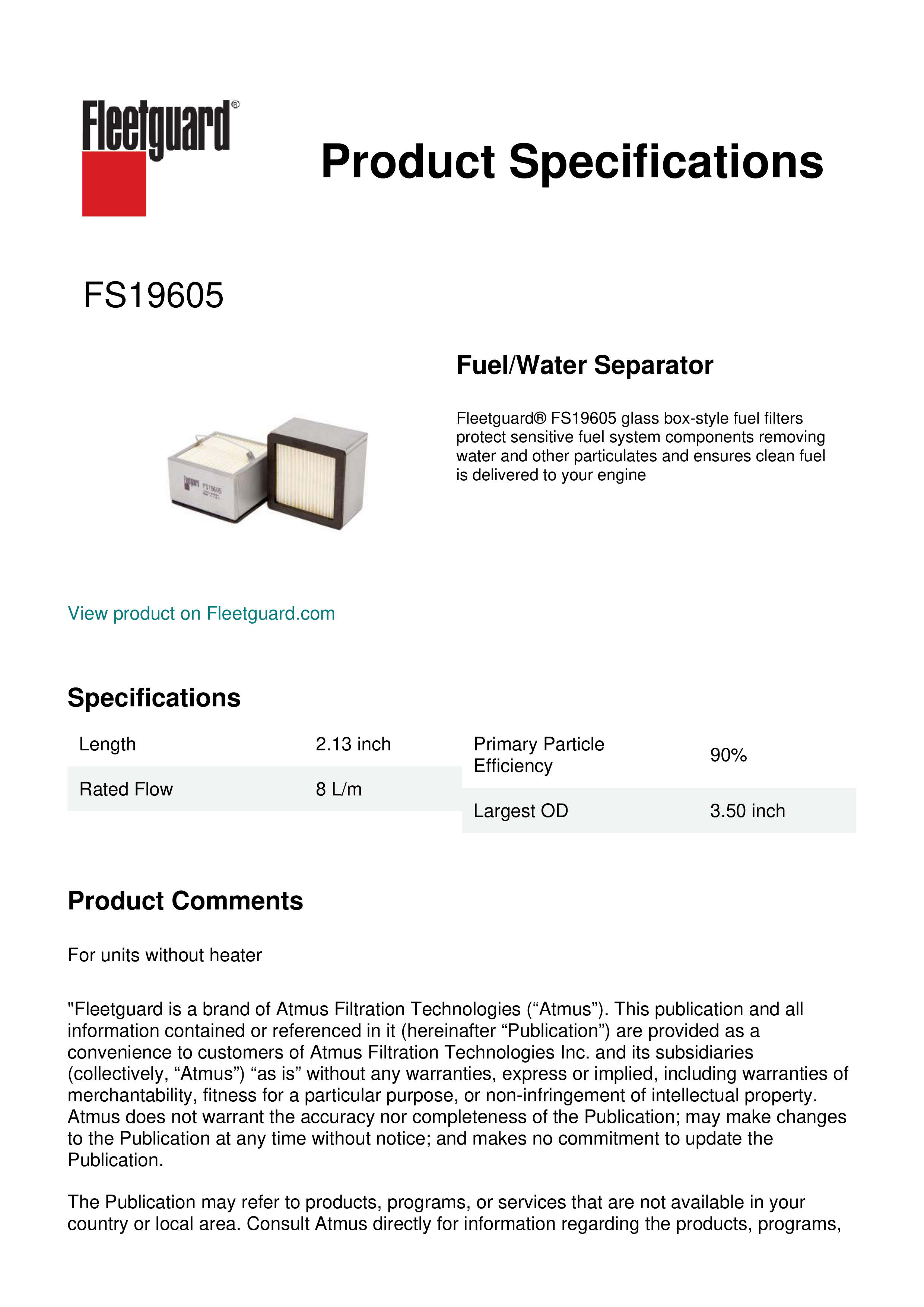Fleetguard® FS19605 glass box-style fuel filters protect sensitive fuel system components removing water and other particulates and ensures clean fuel is delivered to your engineSpecification