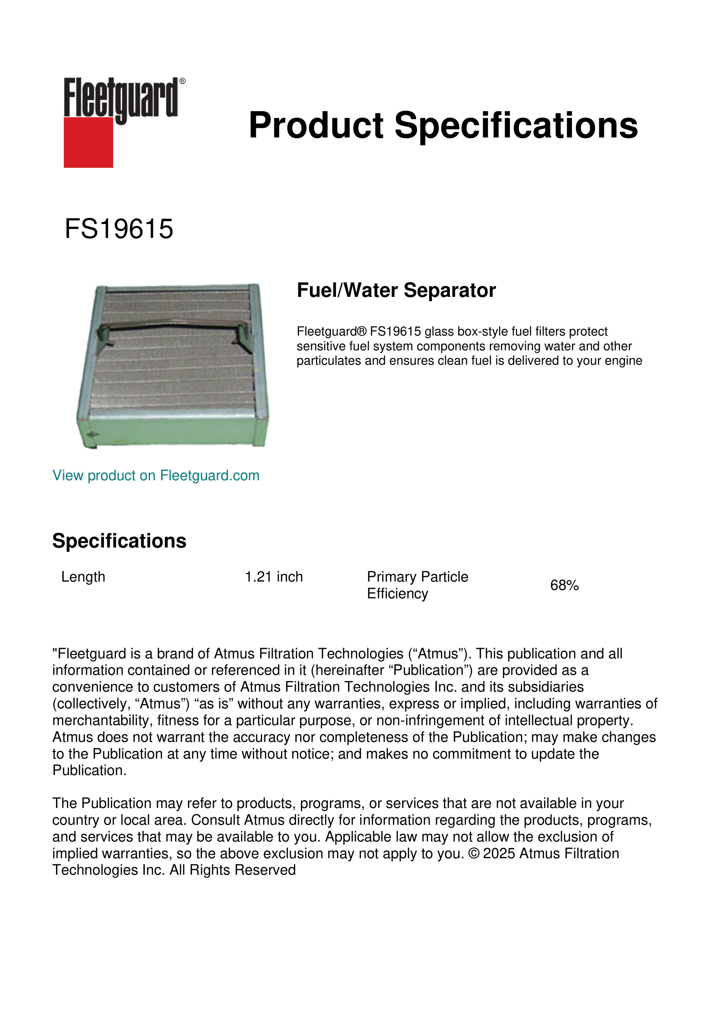 Fleetguard® FS19615 glass box-style fuel filters protect sensitive fuel system components removing water and other particulates and ensures clean fuel is delivered to your engineSpecification