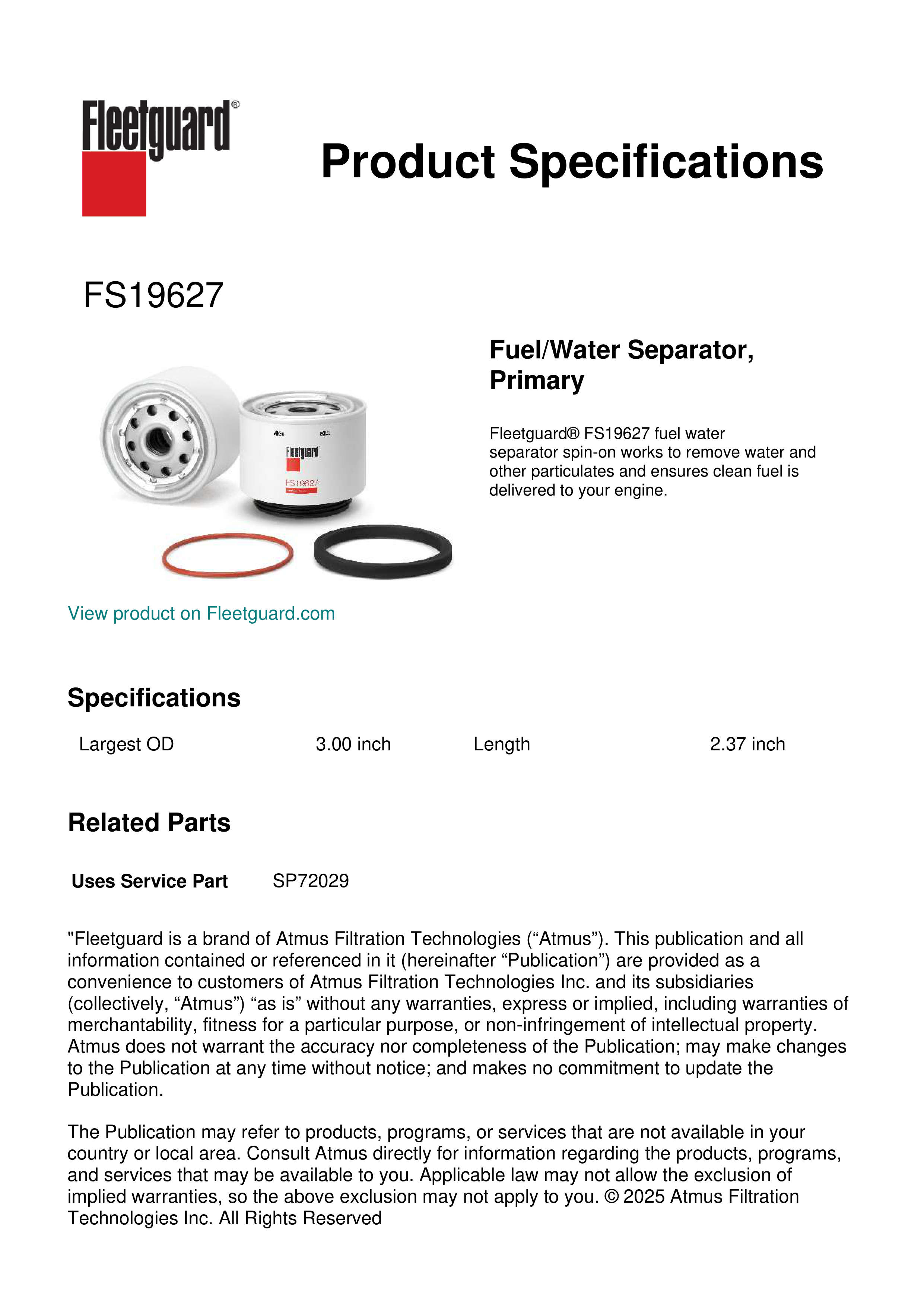 Fleetguard® FS19627 fuel water separator spin-on works to remove water and other particulates and ensures clean fuel is delivered to your engine.Specification