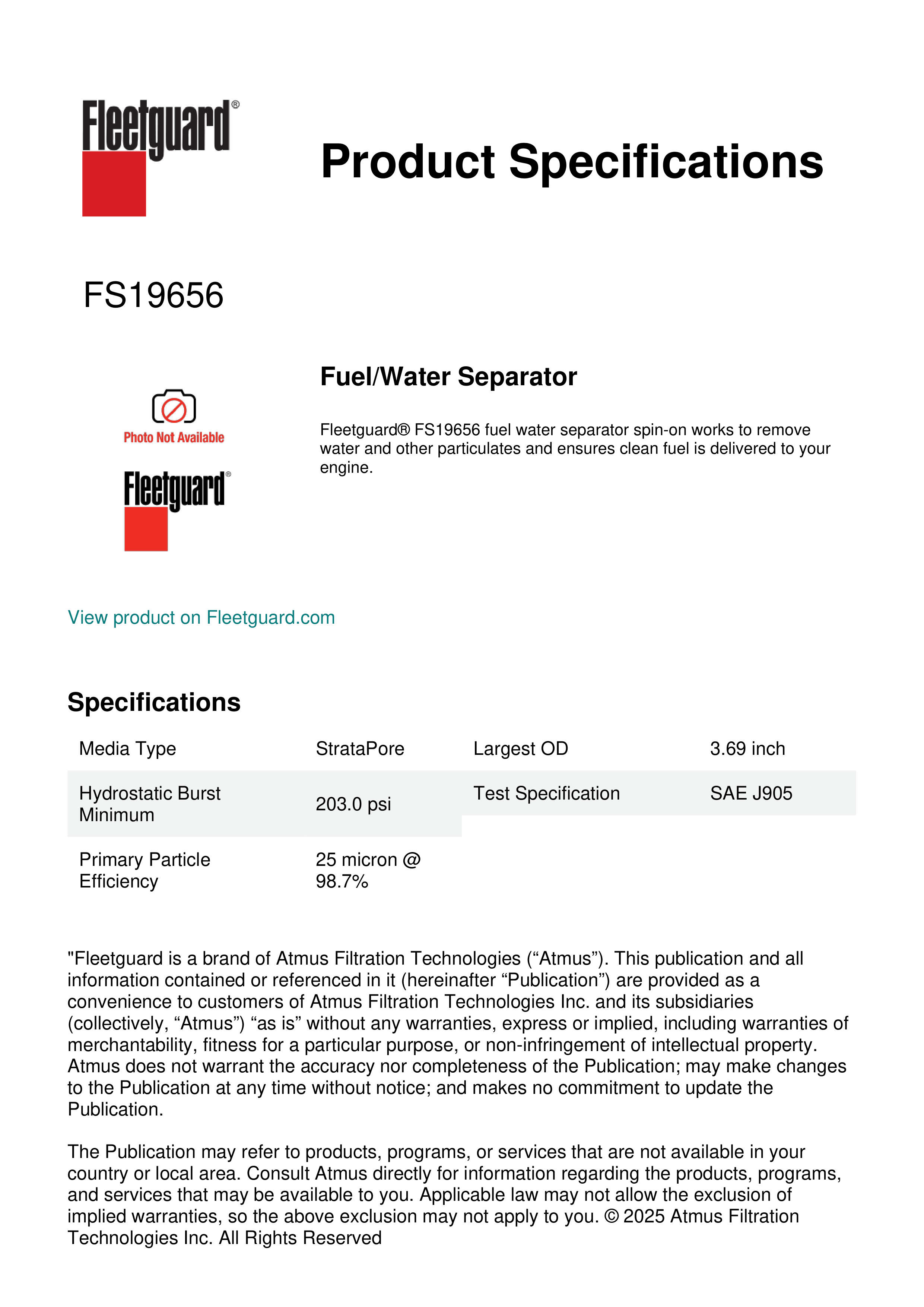 Fleetguard® FS19656 fuel water separator spin-on works to remove water and other particulates and ensures clean fuel is delivered to your engine.Specification
