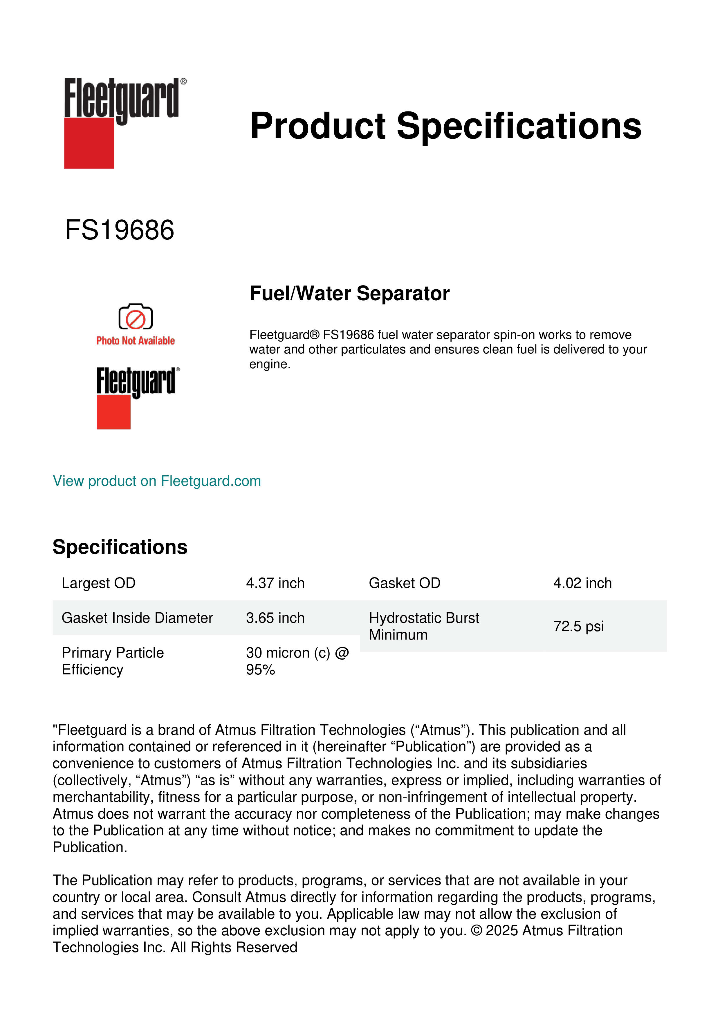 Fleetguard® FS19686 fuel water separator spin-on works to remove water and other particulates and ensures clean fuel is delivered to your engine.Specification