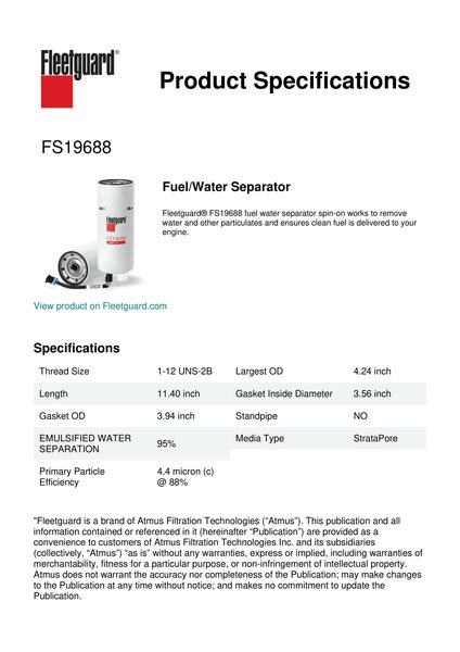 Fleetguard® FS19688 fuel water separator spin-on works to remove water and other particulates and ensures clean fuel is delivered to your engine.Specification