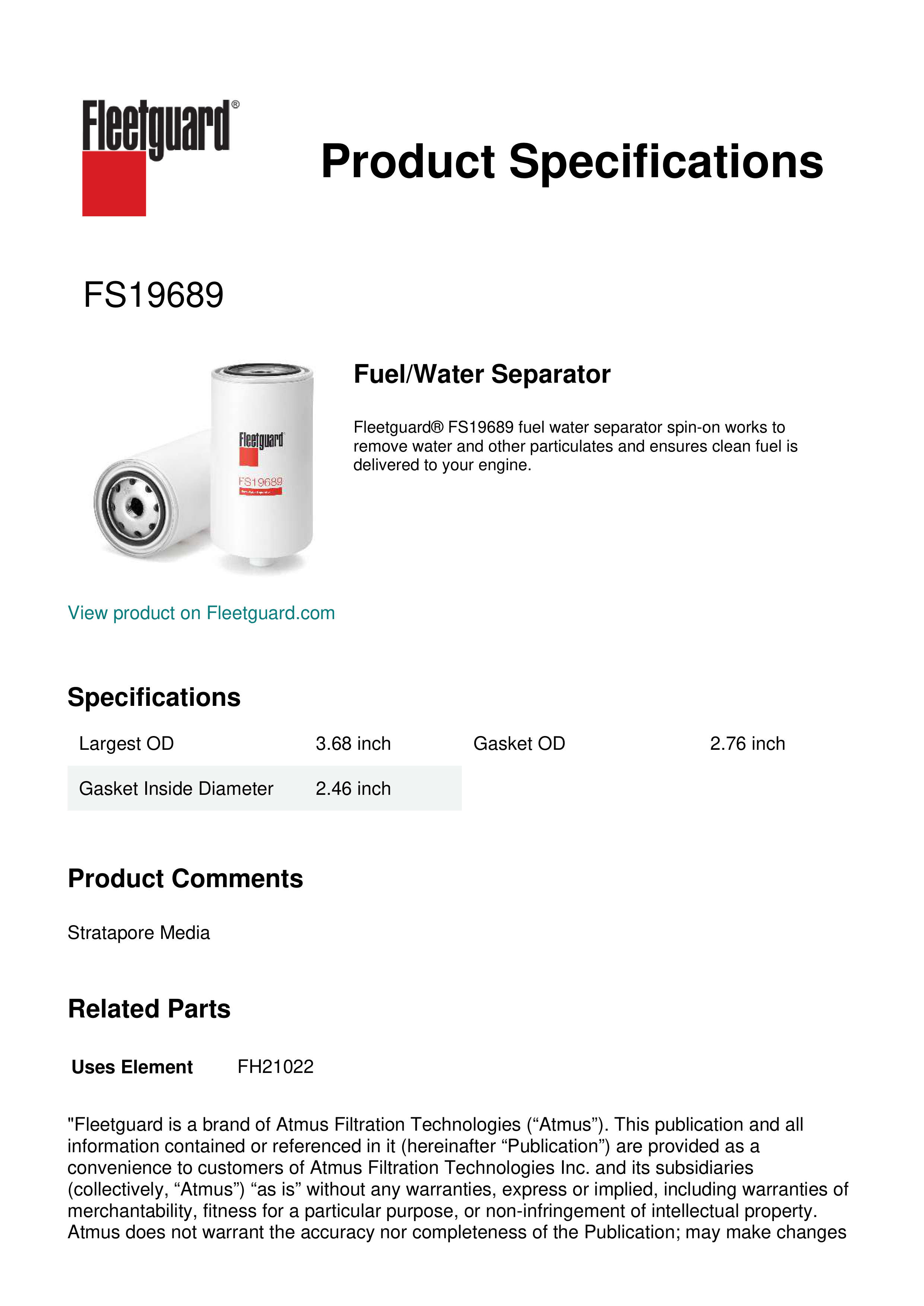 Fleetguard® FS19689 fuel water separator spin-on works to remove water and other particulates and ensures clean fuel is delivered to your engine.Specification