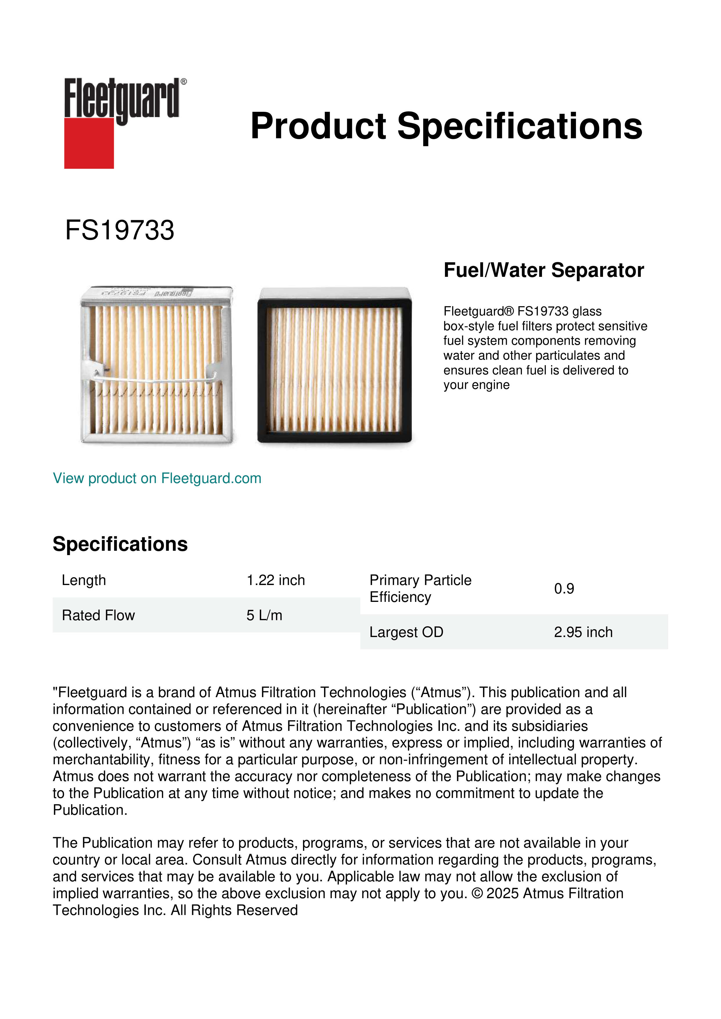 Fleetguard® FS19733 glass box-style fuel filters protect sensitive fuel system components removing water and other particulates and ensures clean fuel is delivered to your engineSpecification