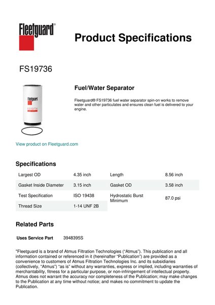 Fleetguard® FS19736 fuel water separator spin-on works to remove water and other particulates and ensures clean fuel is delivered to your engine.Specification