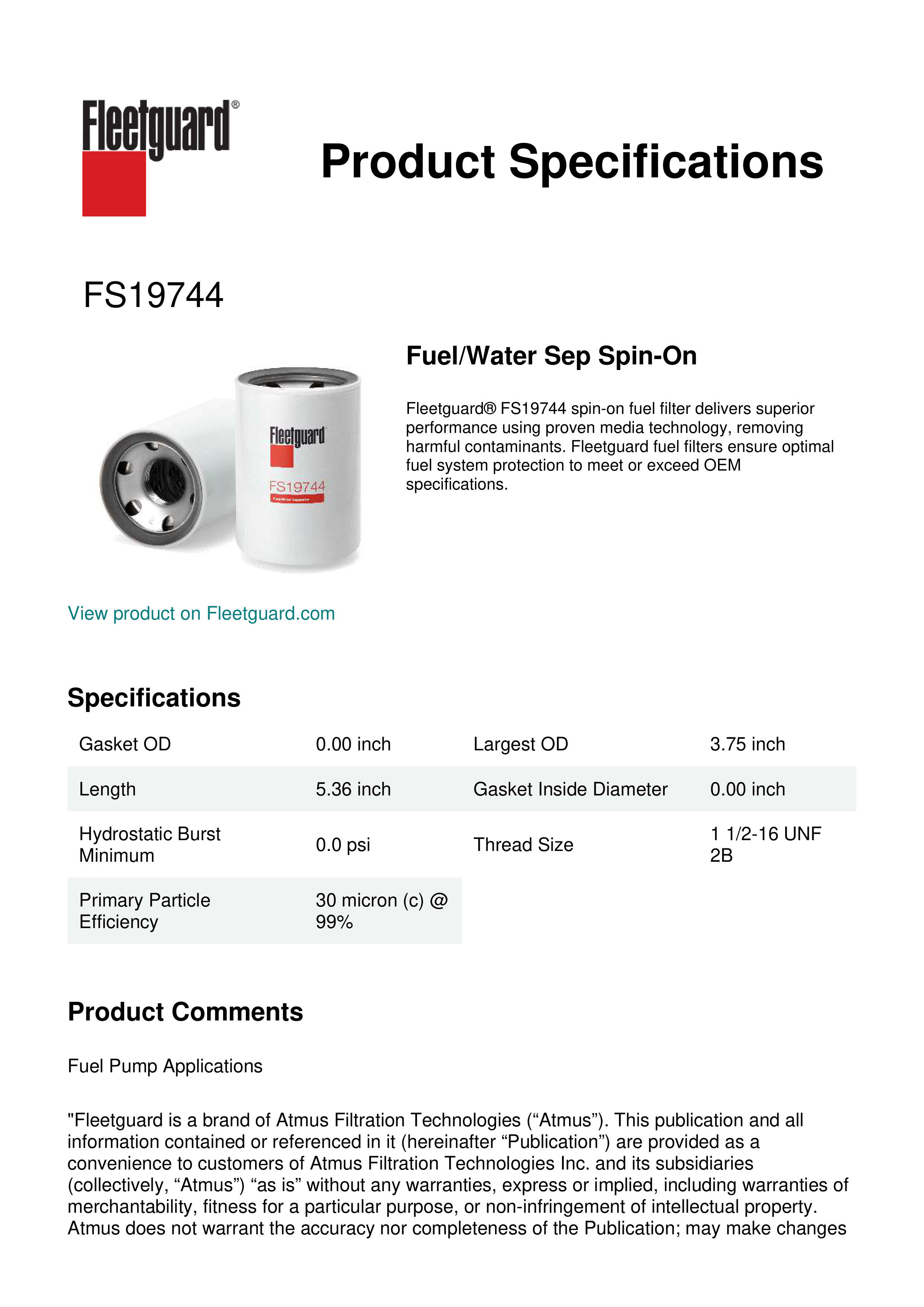 Fleetguard® FS19744 spin-on fuel filter delivers superior performance using proven media technology, removing harmful contaminants. Fleetguard fuel filters ensure optimal fuel system protection to meet or exceed OEM specifications.Specification