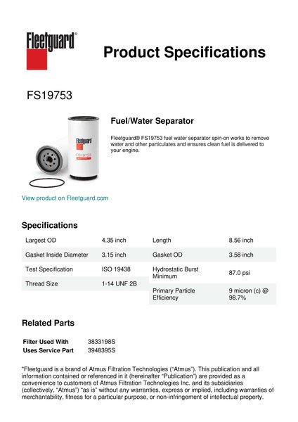 Fleetguard® FS19753 fuel water separator spin-on works to remove water and other particulates and ensures clean fuel is delivered to your engine.Specification