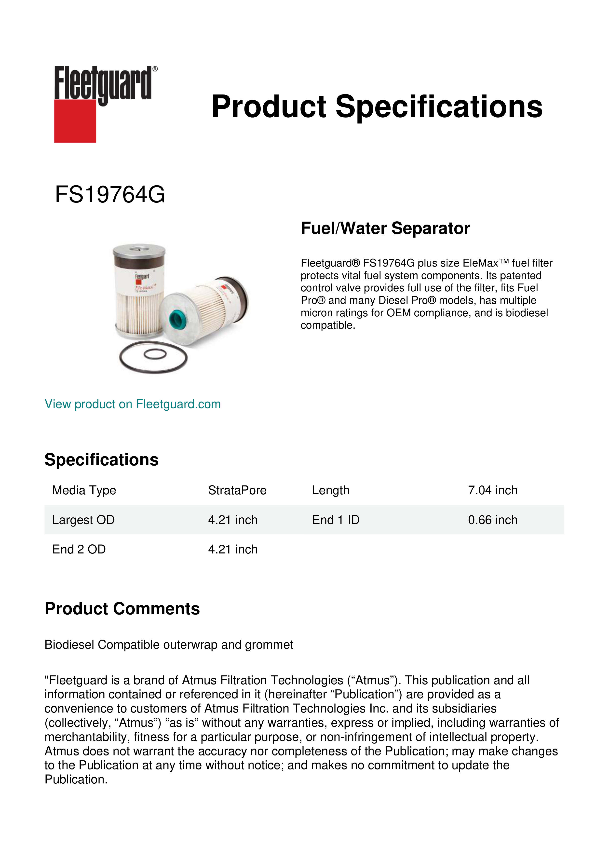 Fleetguard® FS19764G plus size EleMax™ fuel filter protects vital fuel system components. Its patented control valve provides full use of the filter, fits Fuel Pro® and many Diesel Pro® models, has multiple micron ratings for OEM compliance, and is biodiesel compatible.Specification