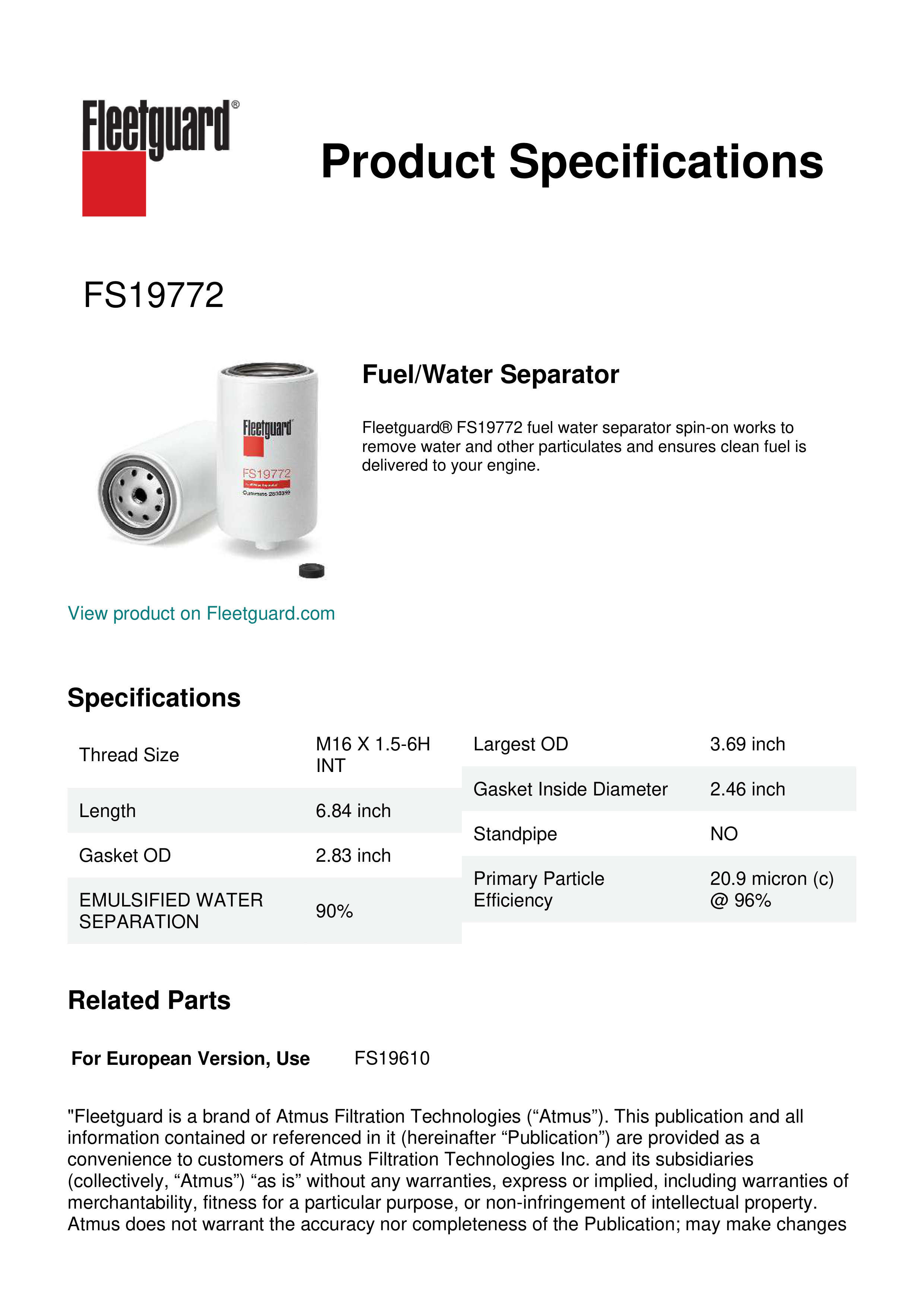 Fleetguard® FS19772 fuel water separator spin-on works to remove water and other particulates and ensures clean fuel is delivered to your engine.Specification