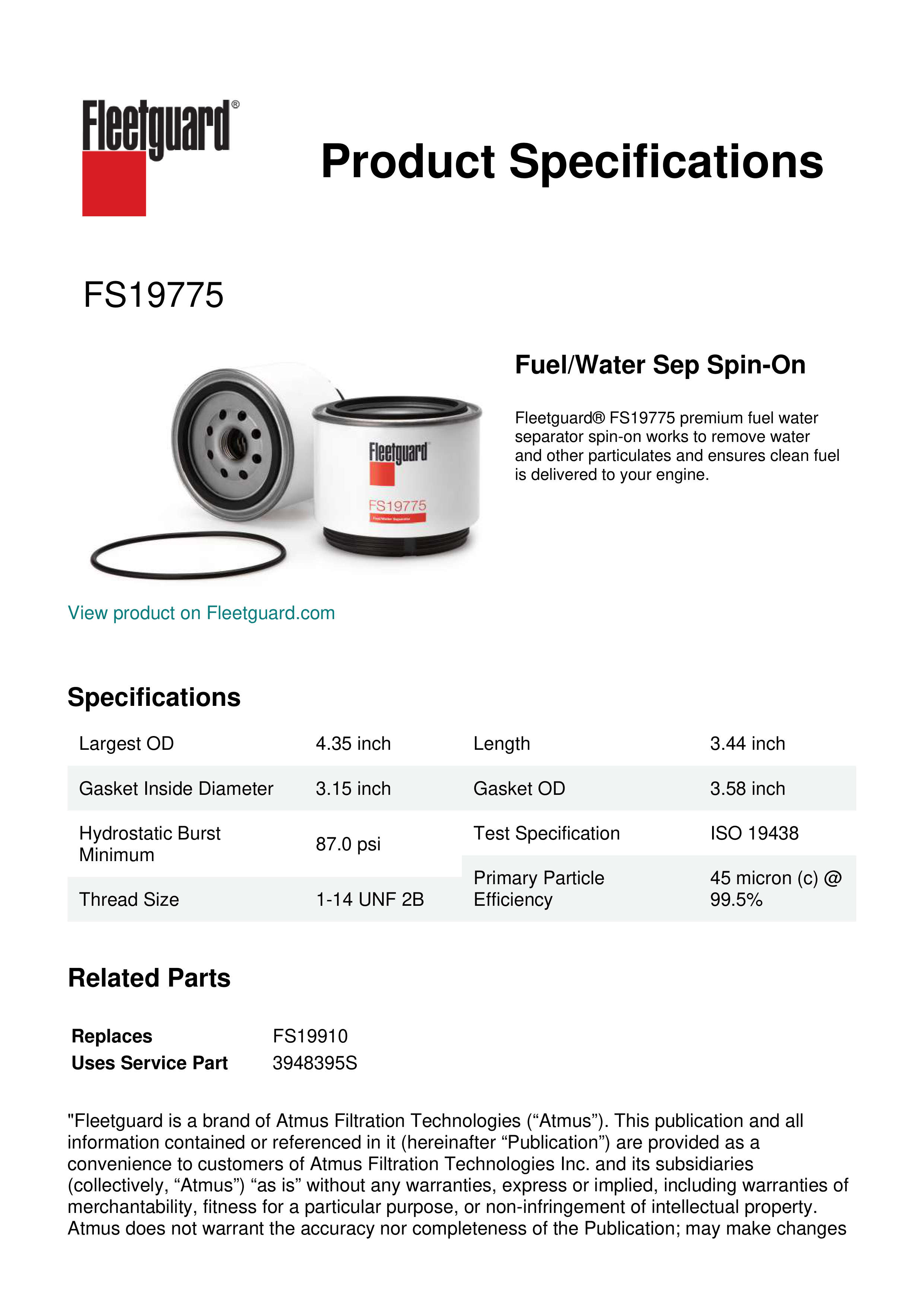 Fleetguard® FS19775 premium fuel water separator spin-on works to remove water and other particulates and ensures clean fuel is delivered to your engine.Specification