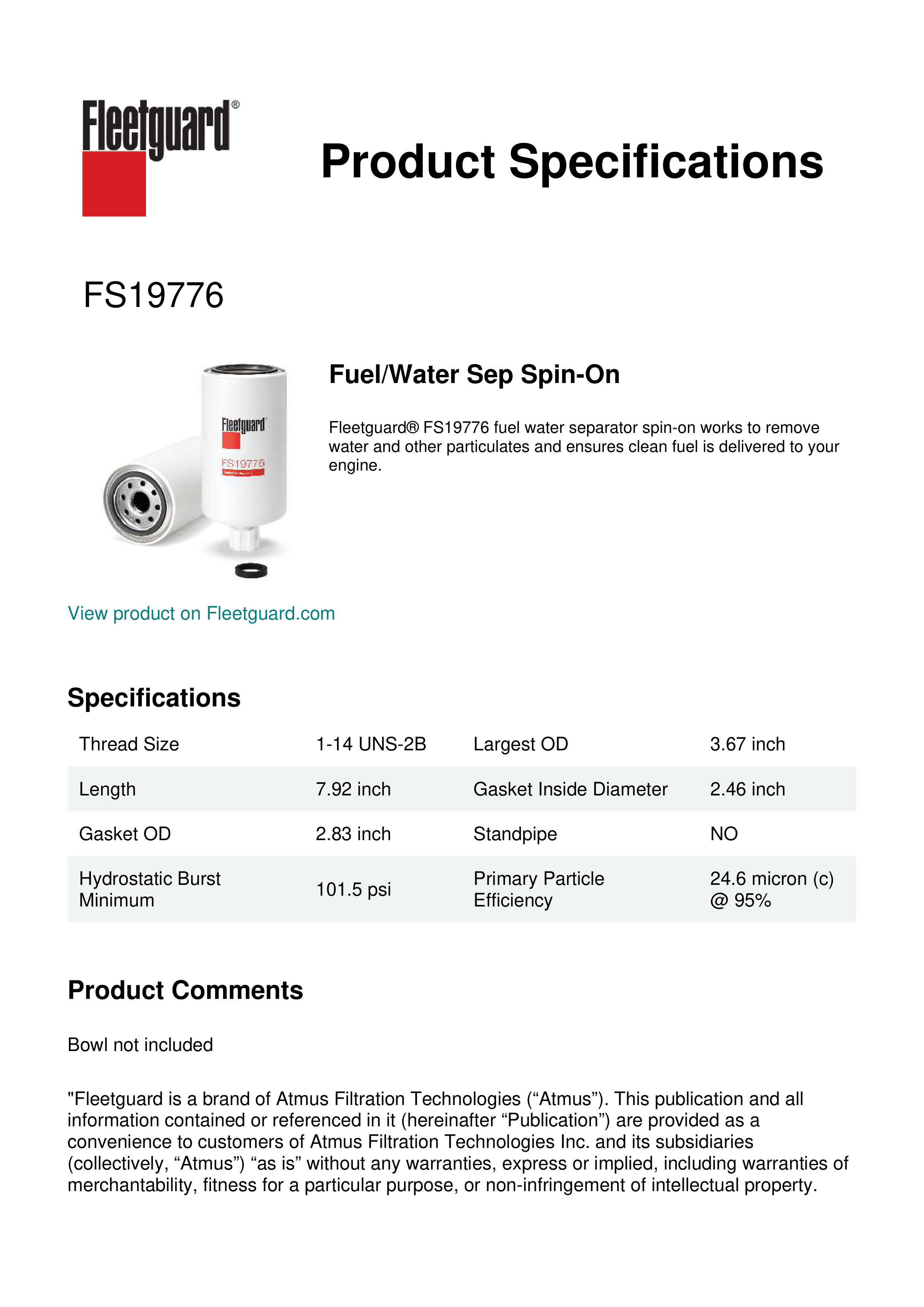 Fleetguard® FS19776 fuel water separator spin-on works to remove water and other particulates and ensures clean fuel is delivered to your engine.Specification