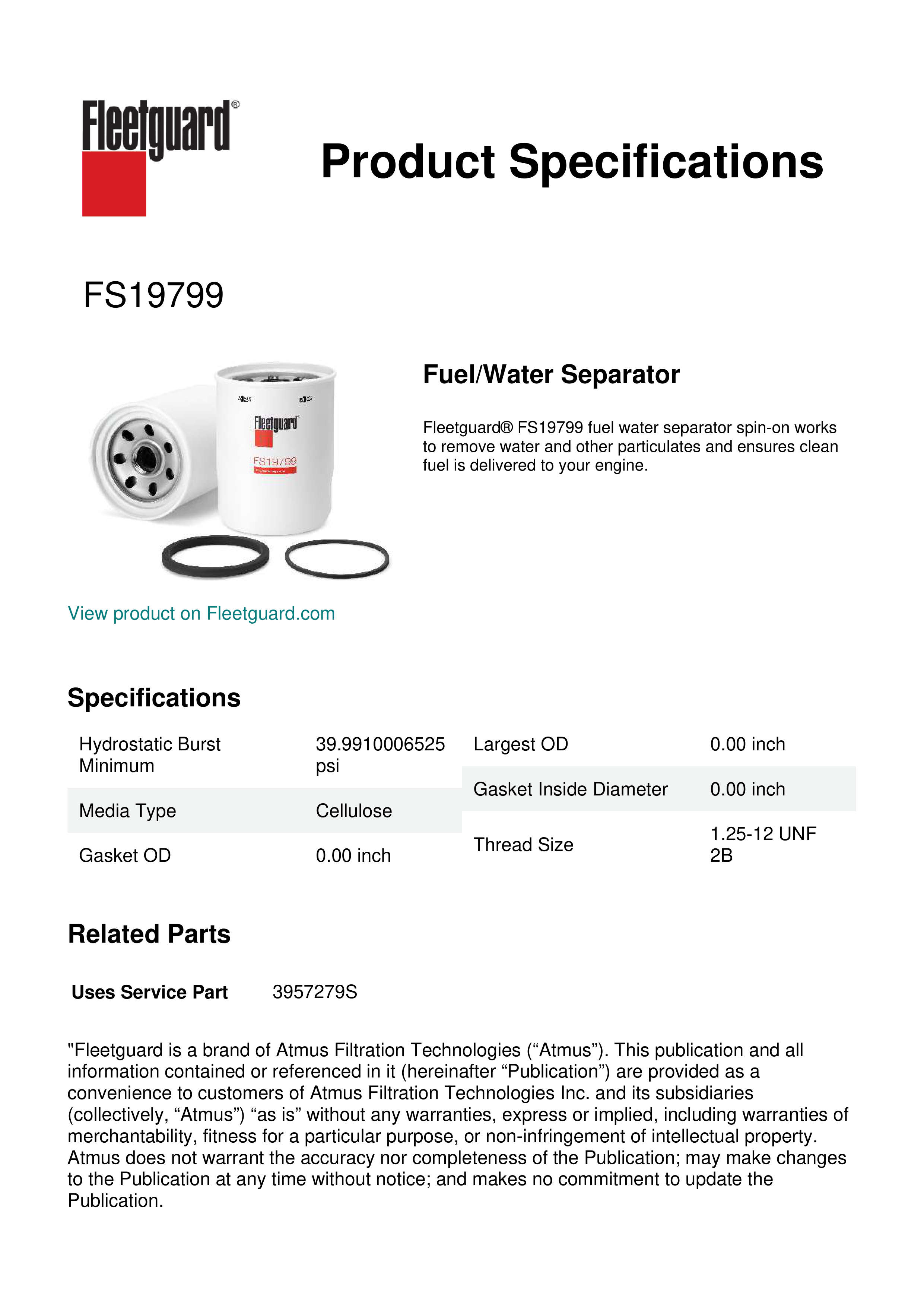 Fleetguard® FS19799 fuel water separator spin-on works to remove water and other particulates and ensures clean fuel is delivered to your engine.Specification