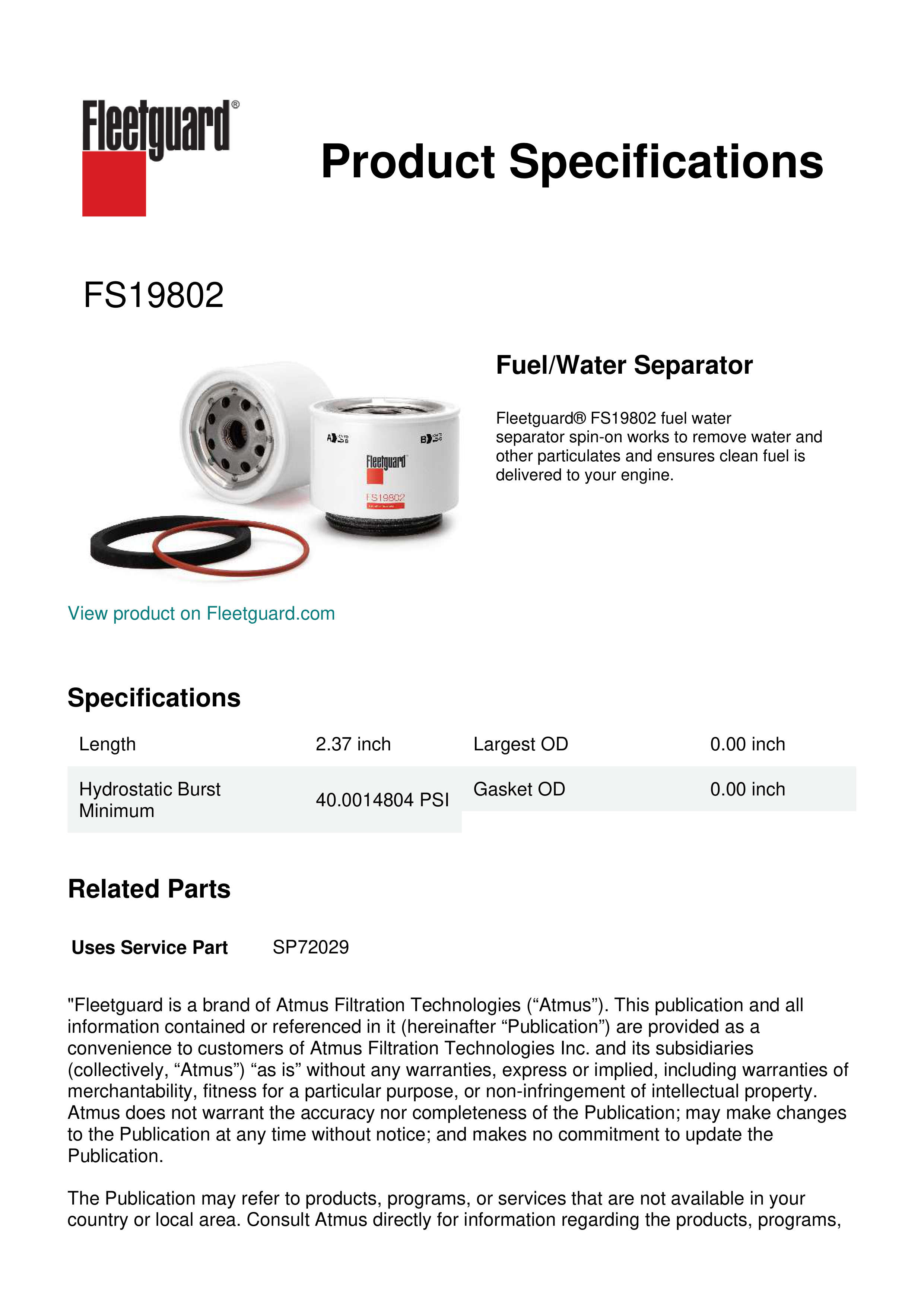 Fleetguard® FS19802 fuel water separator spin-on works to remove water and other particulates and ensures clean fuel is delivered to your engine.Specification