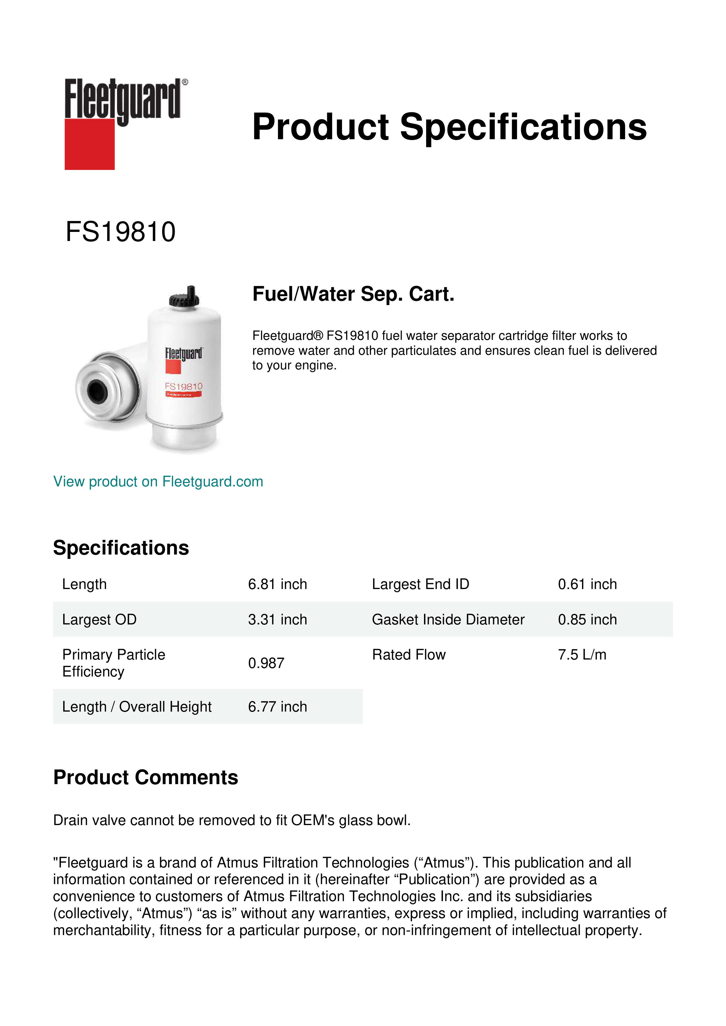 Fleetguard® FS19810 fuel water separator cartridge filter works to remove water and other particulates and ensures clean fuel is delivered to your engine.Specification