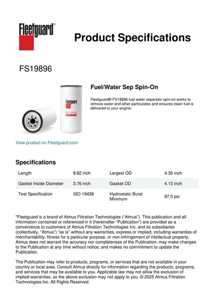 Fleetguard® FS19896 fuel water separator spin-on works to remove water and other particulates and ensures clean fuel is delivered to your engine.Specification