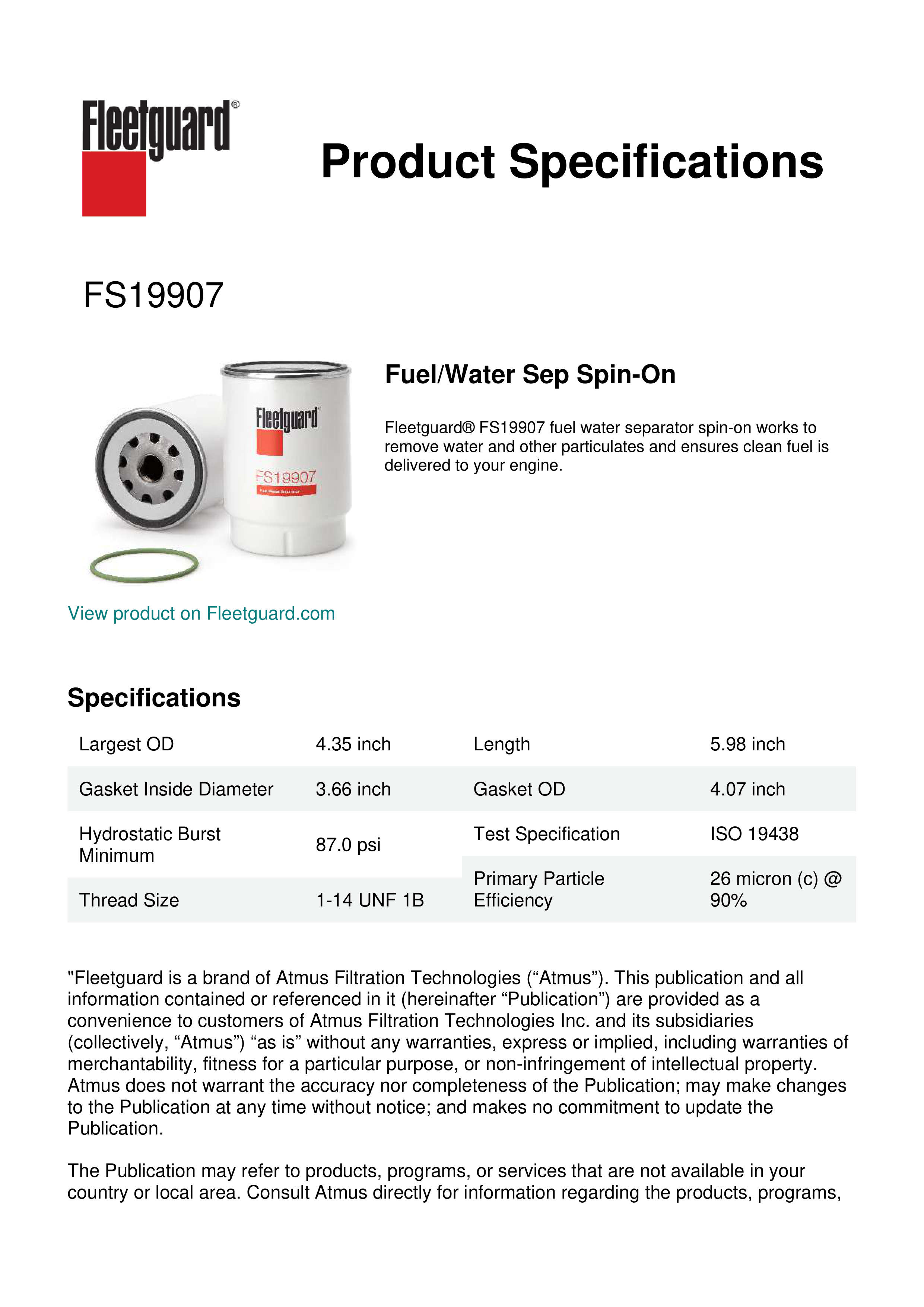 Fleetguard® FS19907 fuel water separator spin-on works to remove water and other particulates and ensures clean fuel is delivered to your engine.Specification