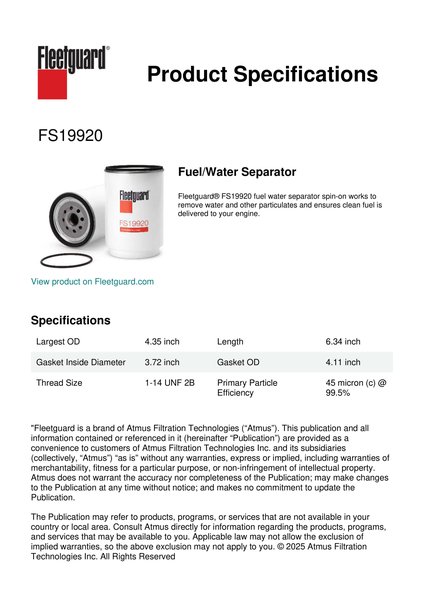 Fleetguard® FS19920 fuel water separator spin-on works to remove water and other particulates and ensures clean fuel is delivered to your engine.Specification