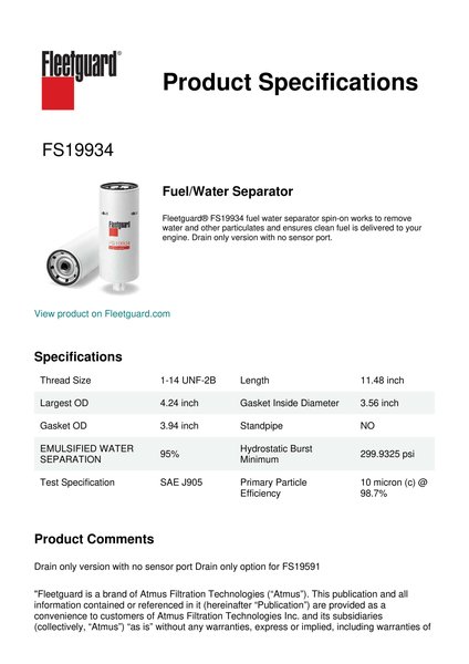 Fleetguard® FS19934 fuel water separator spin-on works to remove water and other particulates and ensures clean fuel is delivered to your engine. Drain only version with no sensor port.Specification