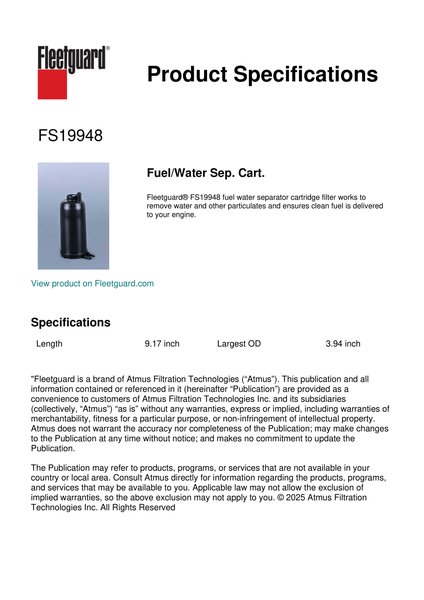 Fleetguard® FS19948 fuel water separator cartridge filter works to remove water and other particulates and ensures clean fuel is delivered to your engine.Specification