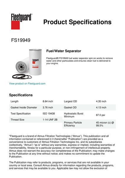 Fleetguard® FS19949 fuel water separator spin-on works to remove water and other particulates and ensures clean fuel is delivered to your engine.Specification