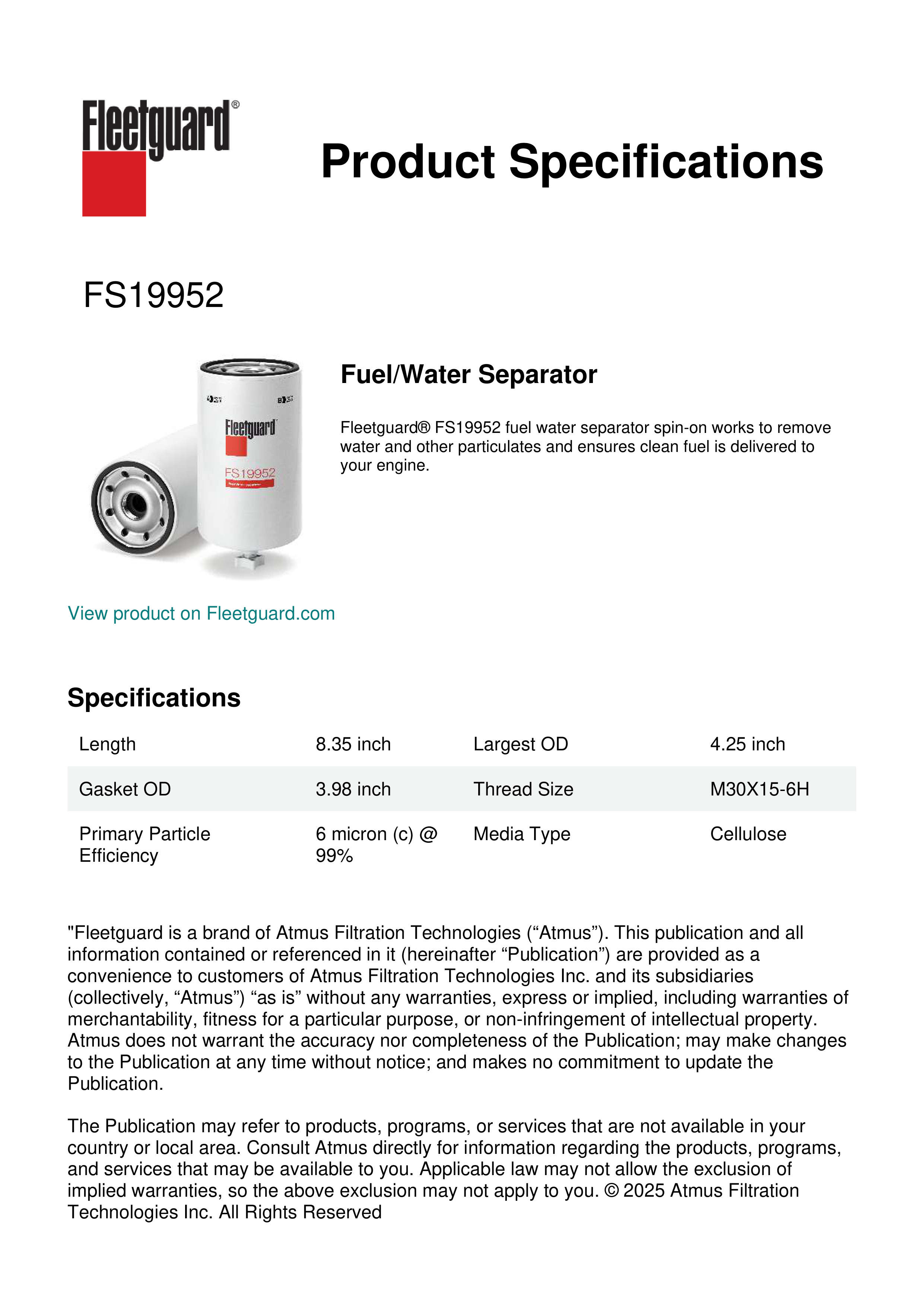 Fleetguard® FS19952 fuel water separator spin-on works to remove water and other particulates and ensures clean fuel is delivered to your engine.Specification