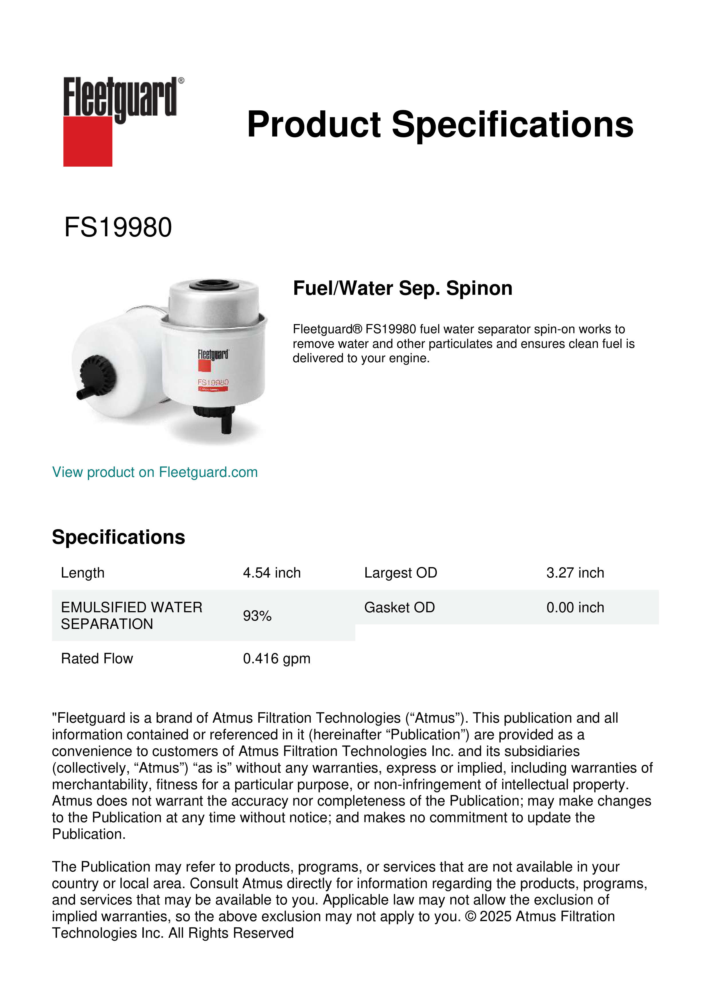 Fleetguard® FS19980 fuel water separator spin-on works to remove water and other particulates and ensures clean fuel is delivered to your engine.Specification