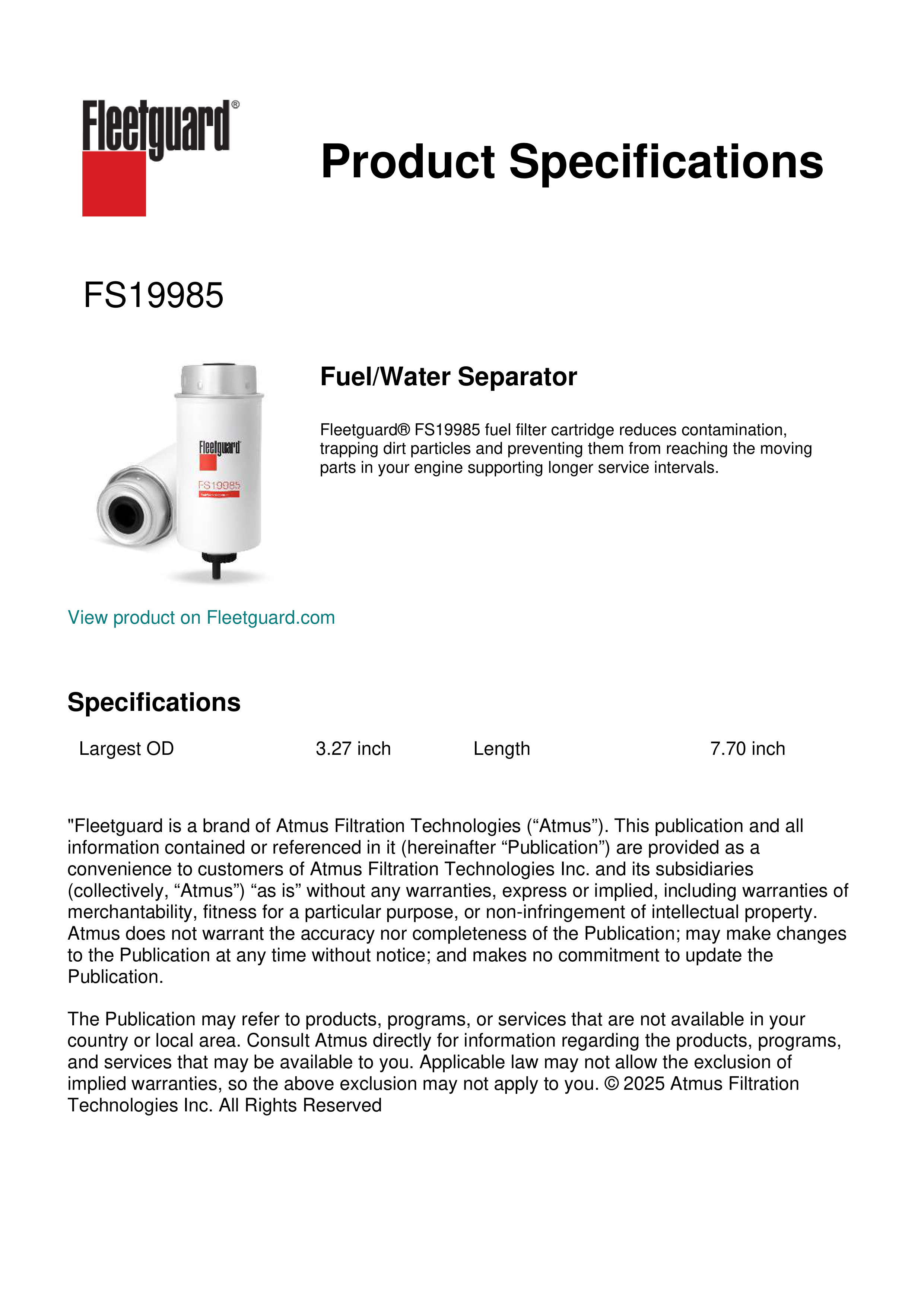 Fleetguard® FS19985 fuel filter cartridge reduces contamination, trapping dirt particles and preventing them from reaching the moving parts in your engine supporting longer service intervals.Specification