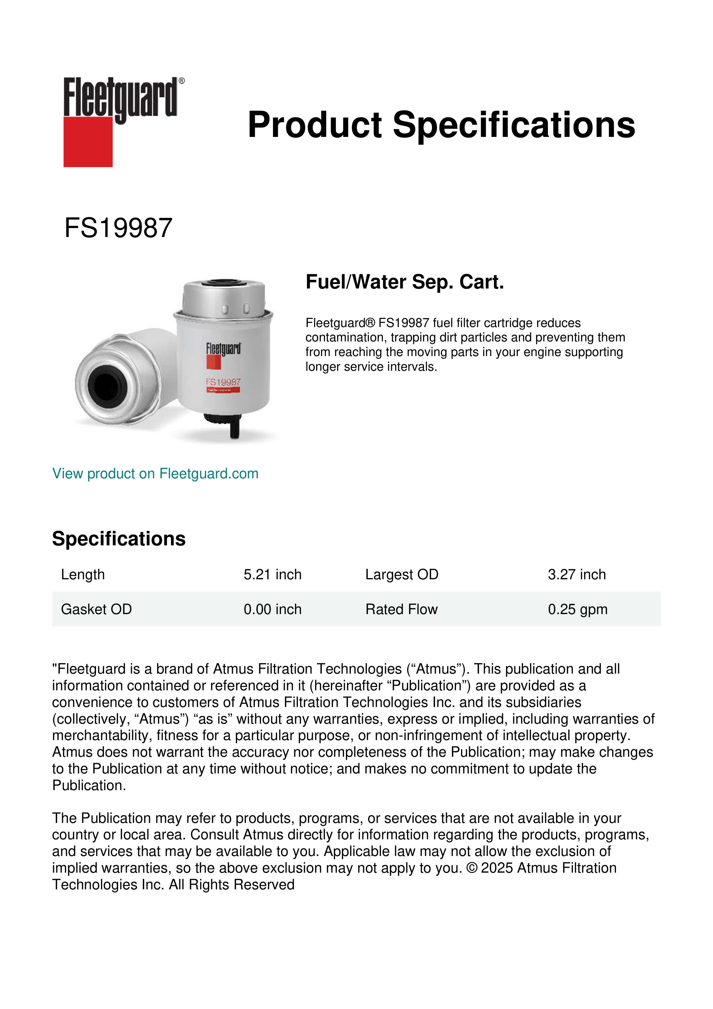 Fleetguard® FS19987 fuel filter cartridge reduces contamination, trapping dirt particles and preventing them from reaching the moving parts in your engine supporting longer service intervals.Specification