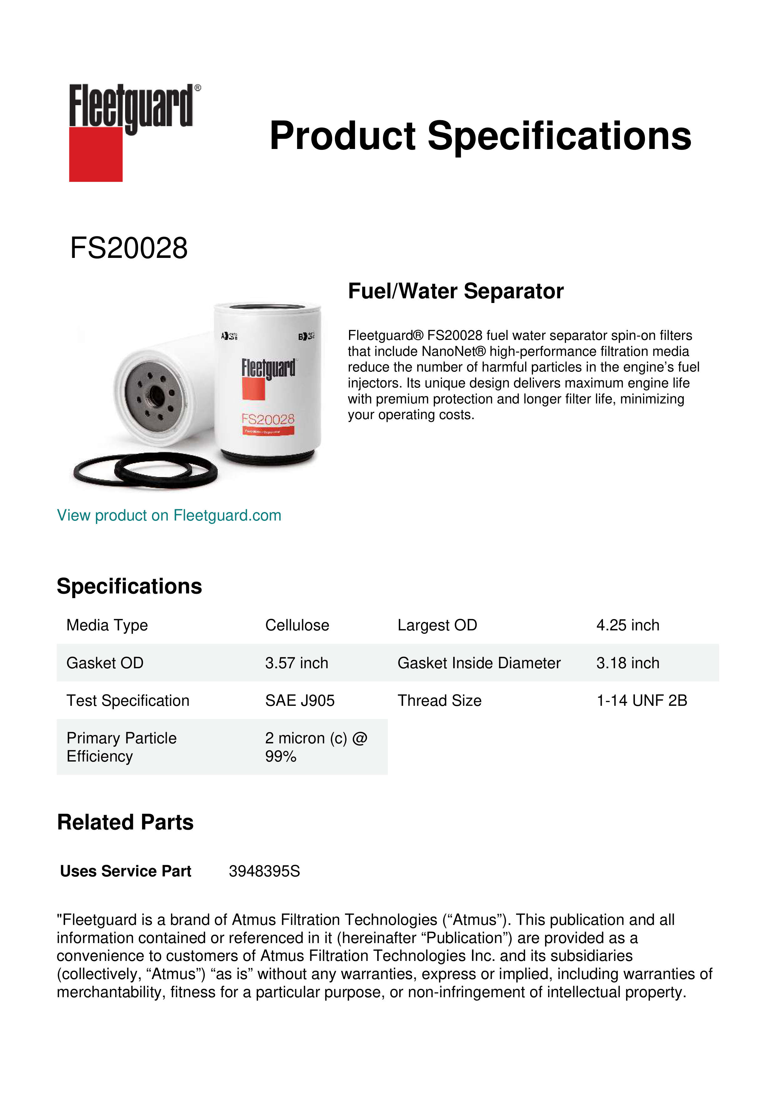 Fleetguard® FS20028 fuel water separator spin-on filters that include NanoNet® high-performance filtration media reduce the number of harmful particles in the engine’s fuel injectors. Its unique design delivers maximum engine life with premium protection and longer filter life, minimizing your operating costs.Specification