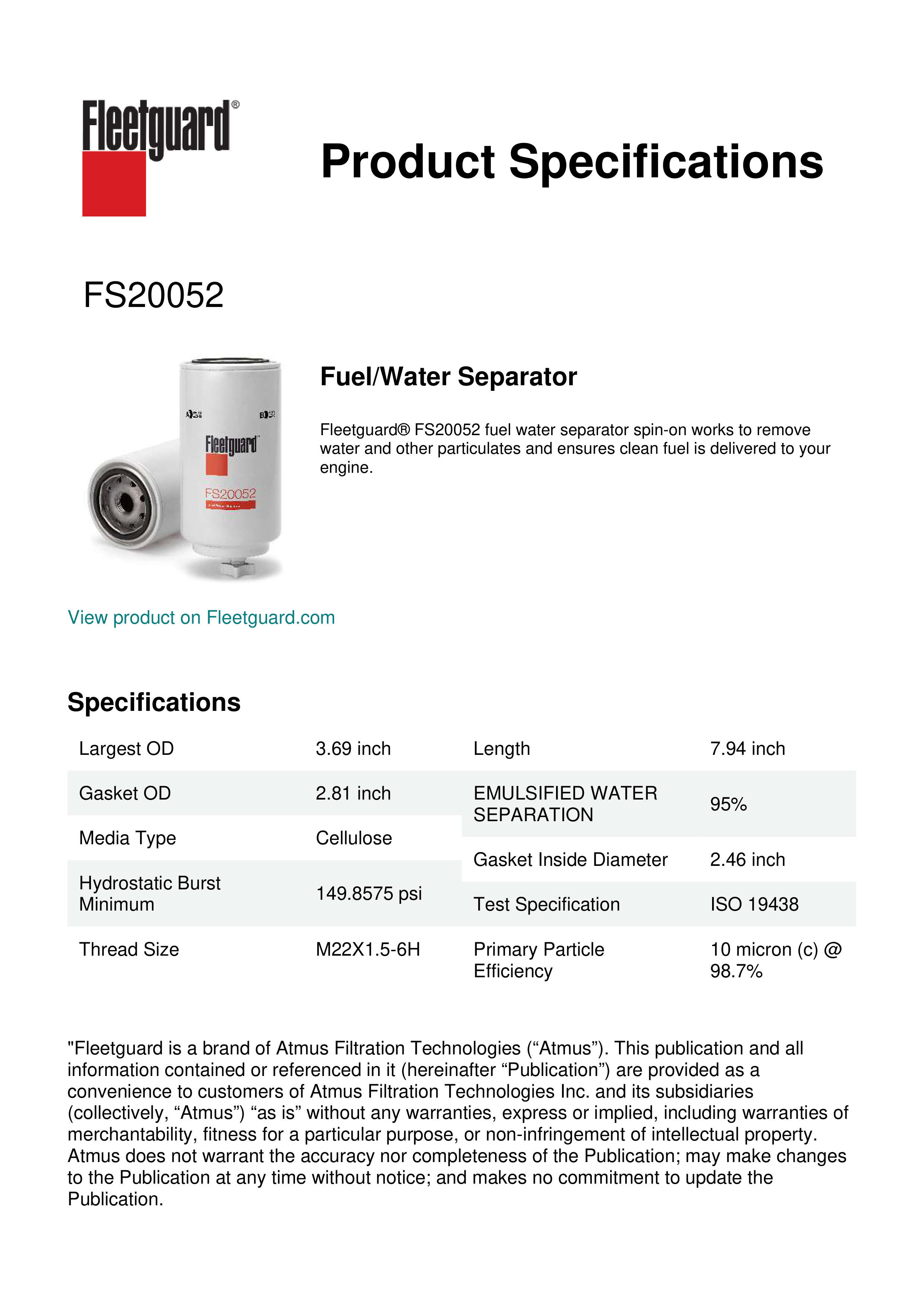 Fleetguard® FS20052 fuel water separator spin-on works to remove water and other particulates and ensures clean fuel is delivered to your engine.Specification