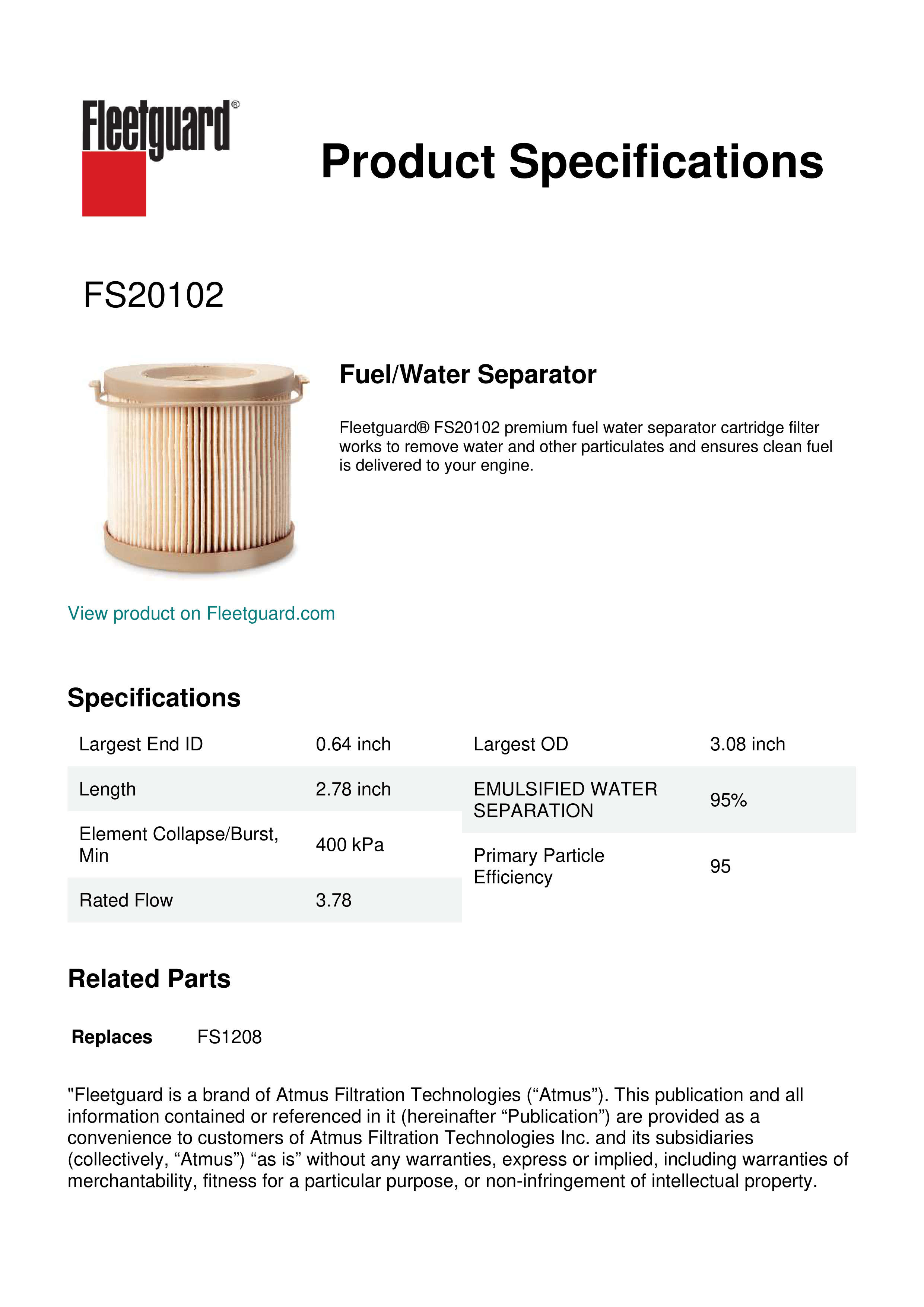 Fleetguard® FS20102 premium fuel water separator cartridge filter works to remove water and other particulates and ensures clean fuel is delivered to your engine.Specification