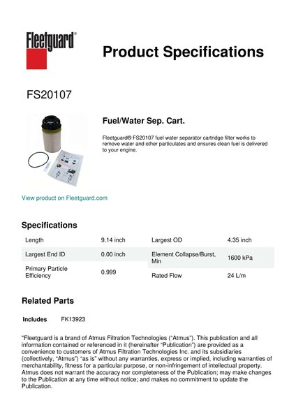 Fleetguard® FS20107 fuel water separator cartridge filter works to remove water and other particulates and ensures clean fuel is delivered to your engine.Specification
