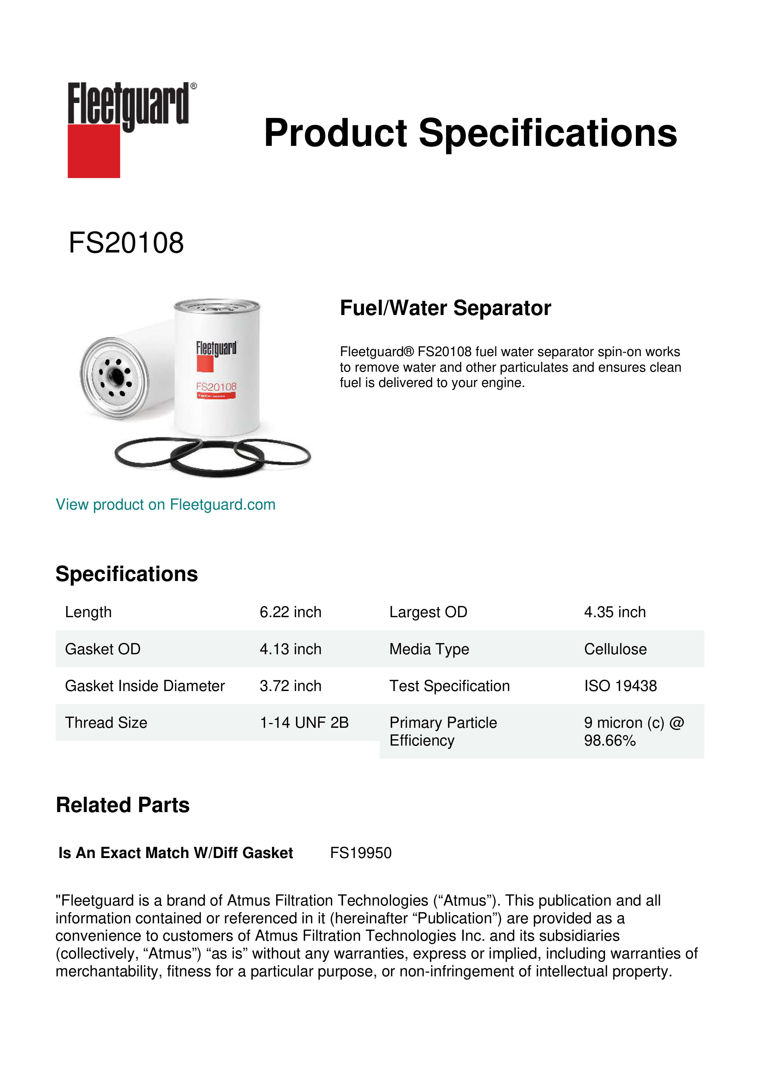 Fleetguard® FS20108 fuel water separator spin-on works to remove water and other particulates and ensures clean fuel is delivered to your engine.Specification