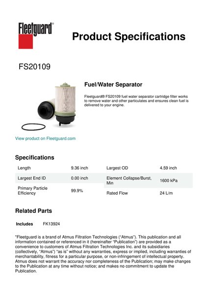Fleetguard® FS20109 fuel water separator cartridge filter works to remove water and other particulates and ensures clean fuel is delivered to your engine.Specification