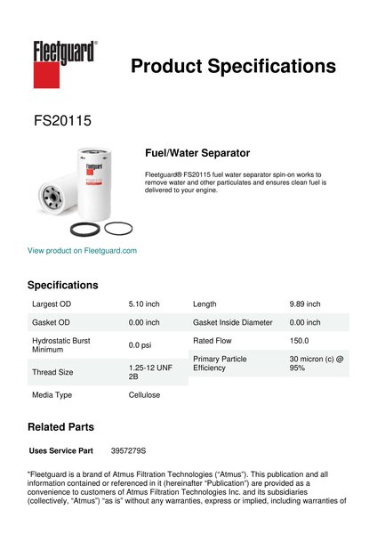 Fleetguard® FS20115 fuel water separator spin-on works to remove water and other particulates and ensures clean fuel is delivered to your engine.Specification
