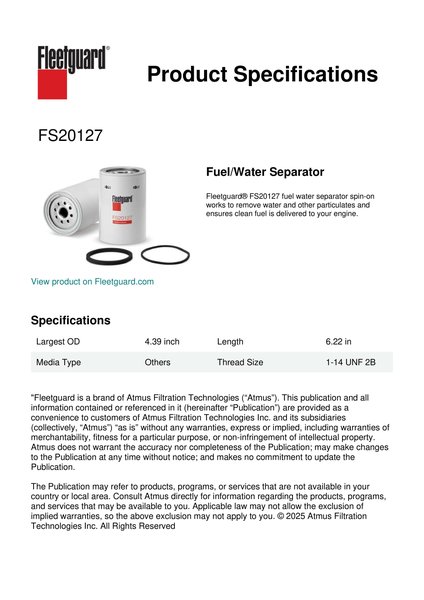 Fleetguard® FS20127 fuel water separator spin-on works to remove water and other particulates and ensures clean fuel is delivered to your engine.Specification