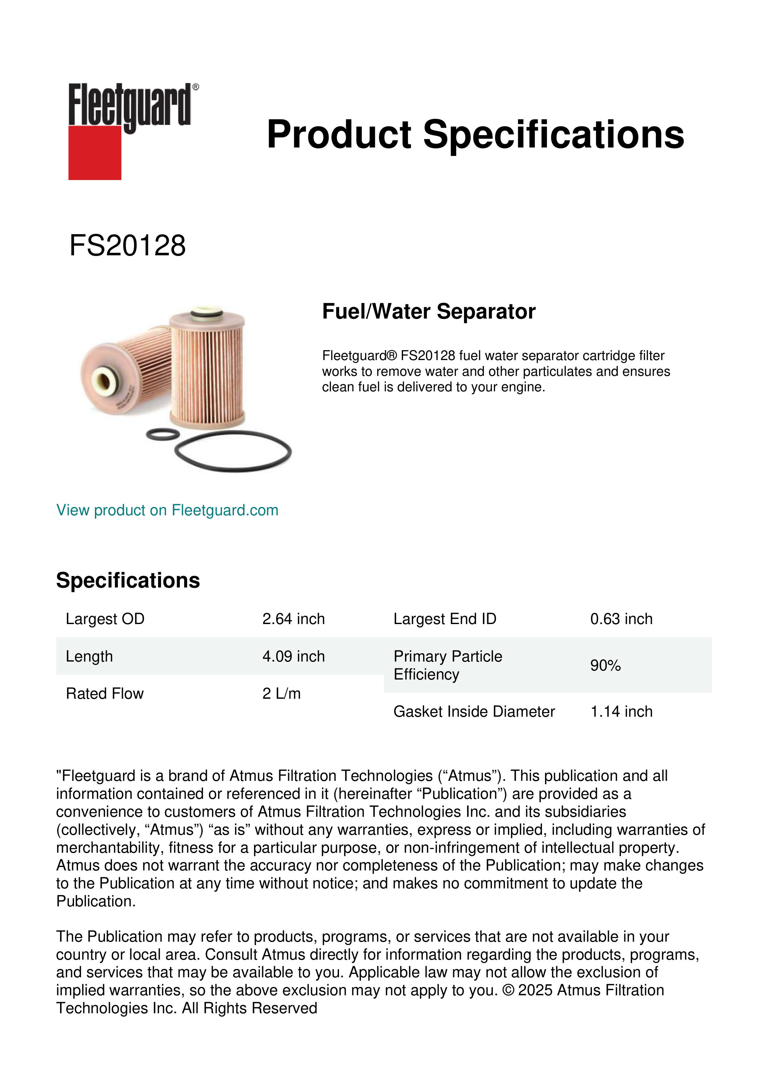 Fleetguard® FS20128 fuel water separator cartridge filter works to remove water and other particulates and ensures clean fuel is delivered to your engine.Specification