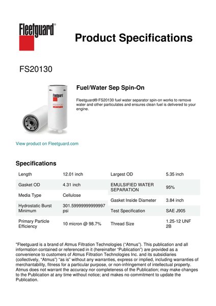 Fleetguard® FS20130 fuel water separator spin-on works to remove water and other particulates and ensures clean fuel is delivered to your engine.Specification
