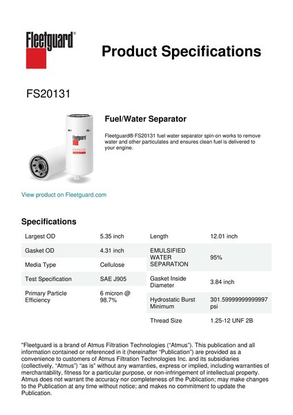 Fleetguard® FS20131 fuel water separator spin-on works to remove water and other particulates and ensures clean fuel is delivered to your engine.Specification