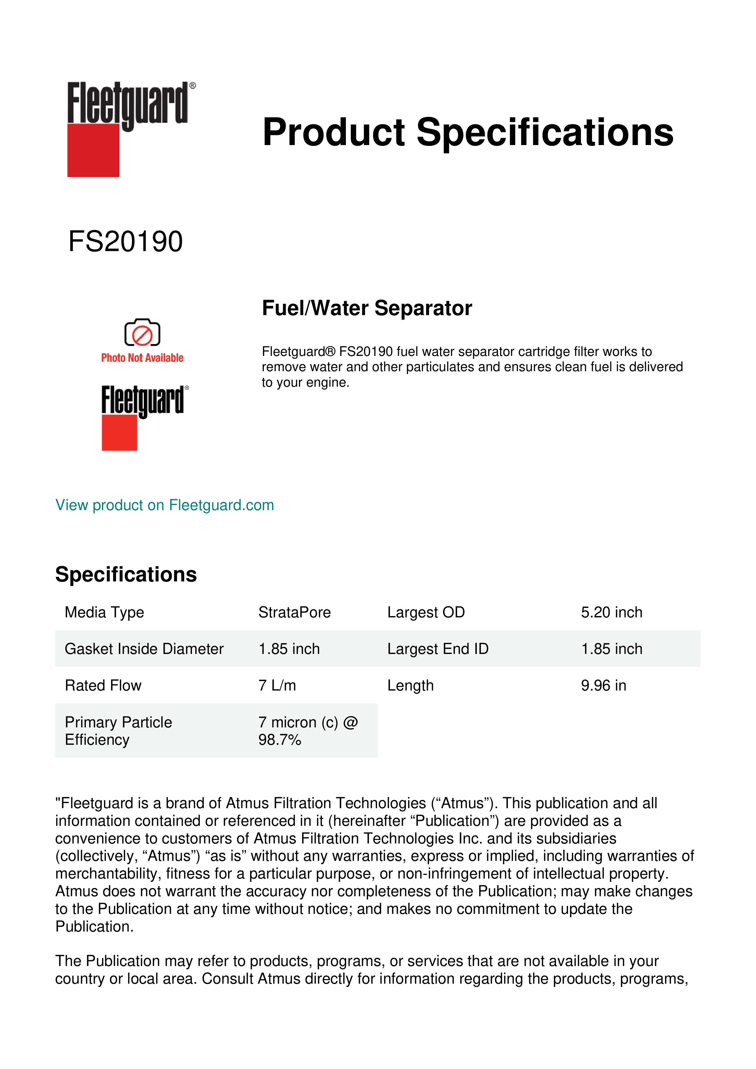 Fleetguard® FS20190 fuel water separator cartridge filter works to remove water and other particulates and ensures clean fuel is delivered to your engine.Specification