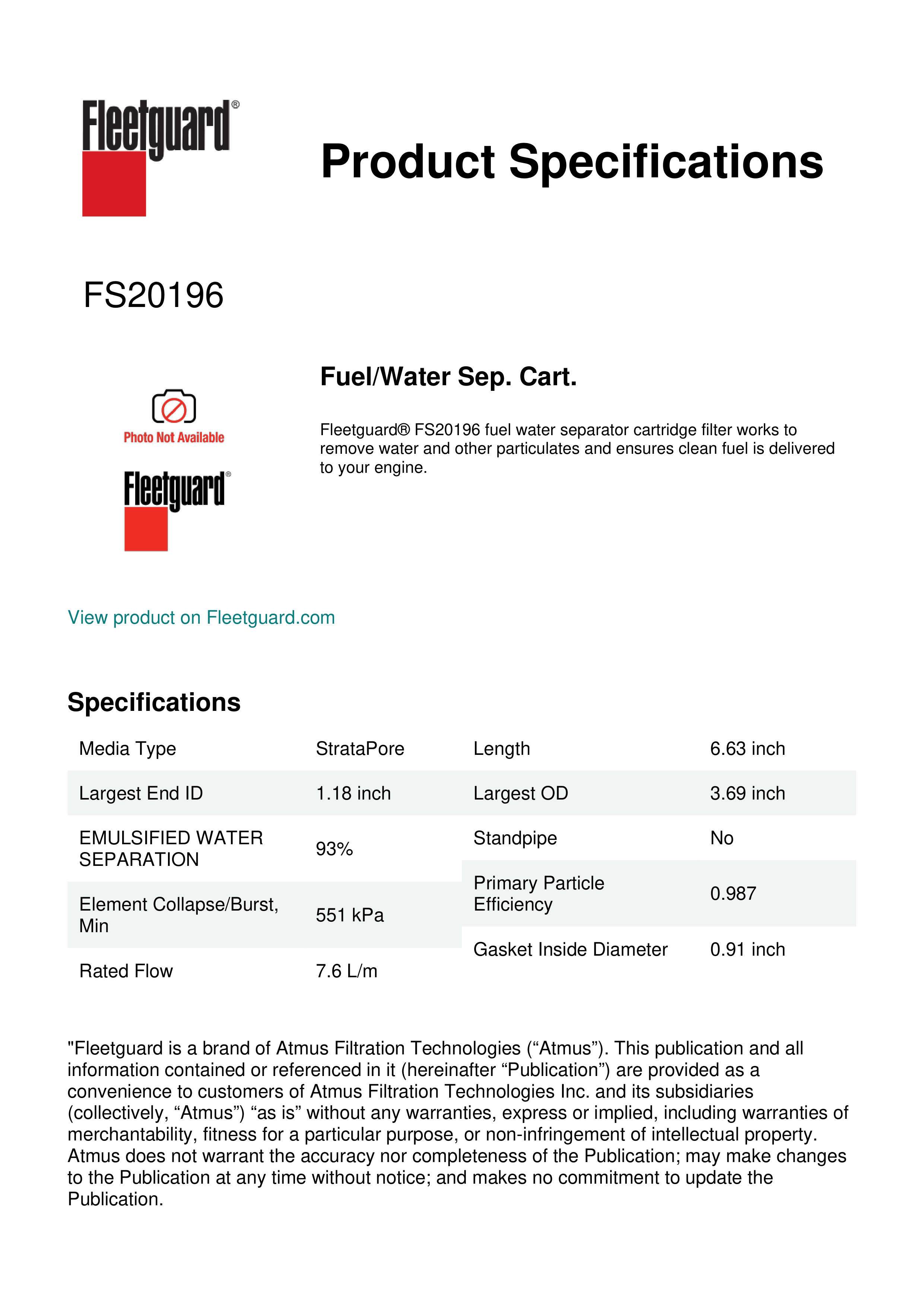 Fleetguard® FS20196 fuel water separator cartridge filter works to remove water and other particulates and ensures clean fuel is delivered to your engine.Specification