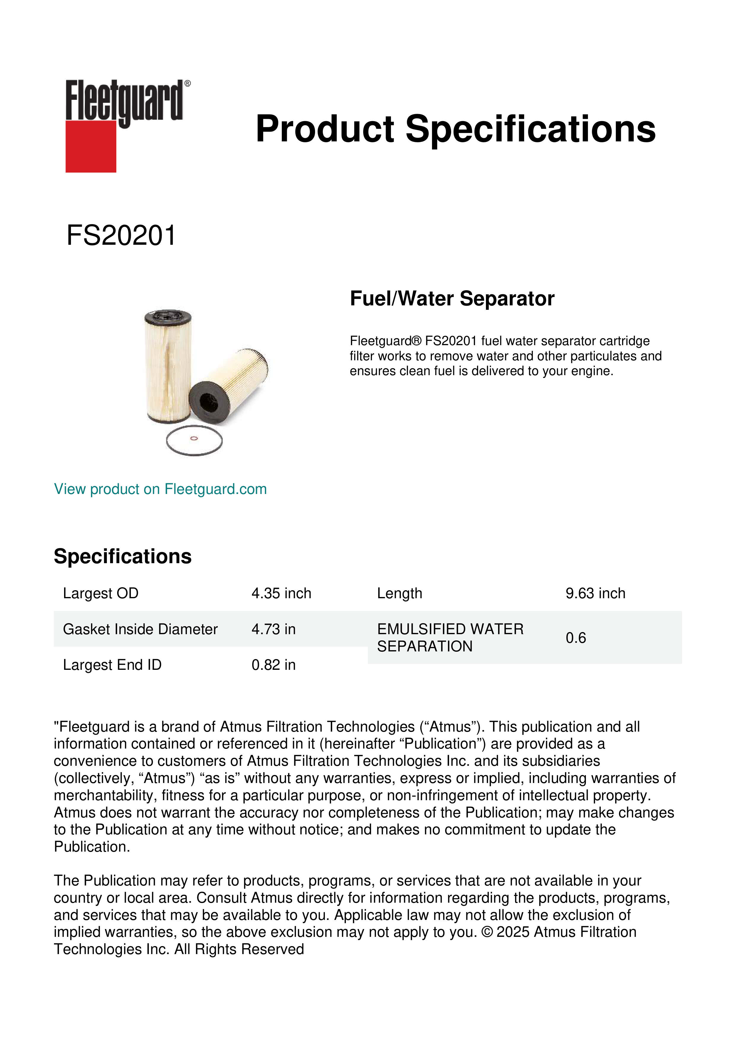 Fleetguard® FS20201 fuel water separator cartridge filter works to remove water and other particulates and ensures clean fuel is delivered to your engine.Specification
