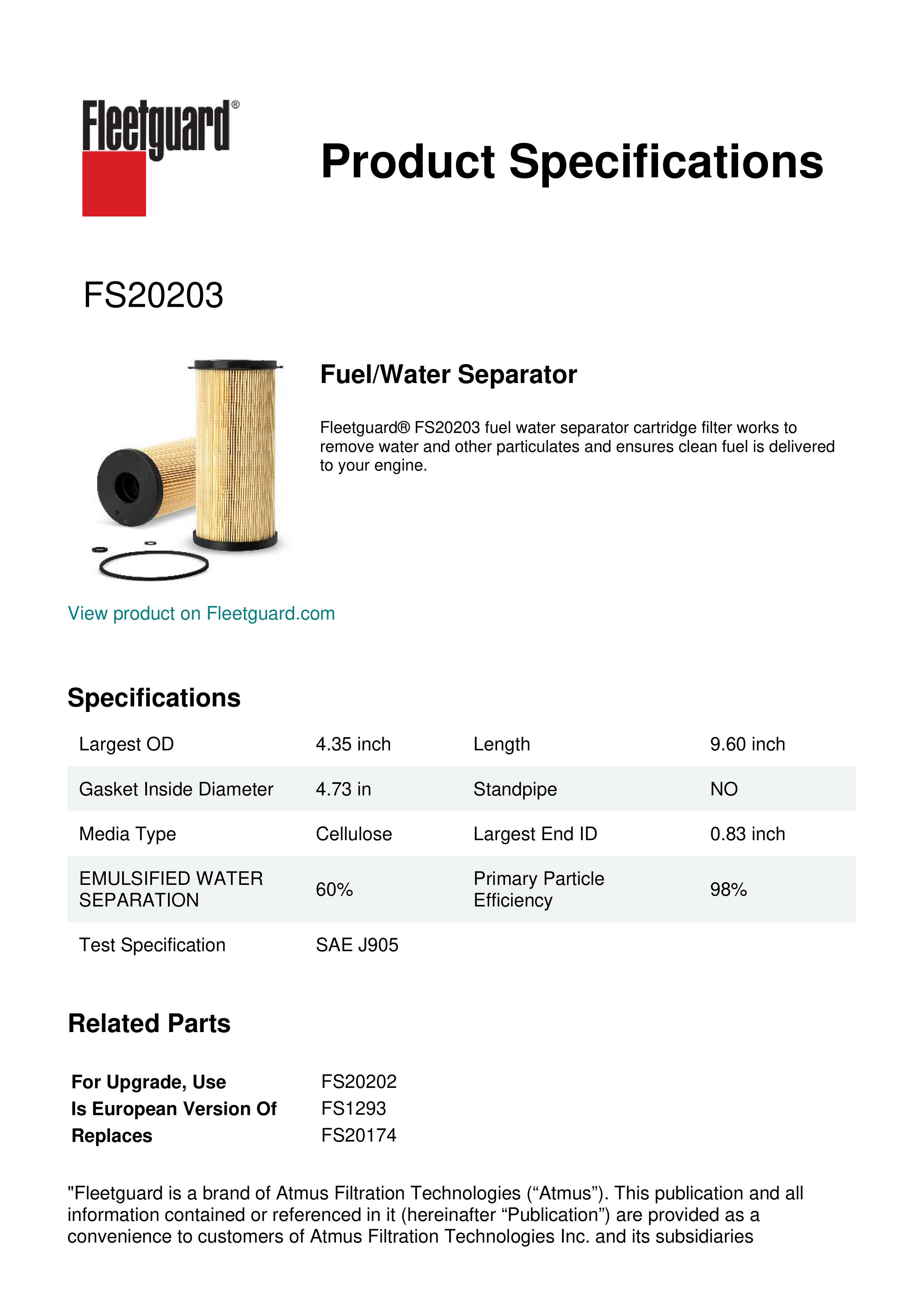 Fleetguard® FS20203 fuel water separator cartridge filter works to remove water and other particulates and ensures clean fuel is delivered to your engine.Specification