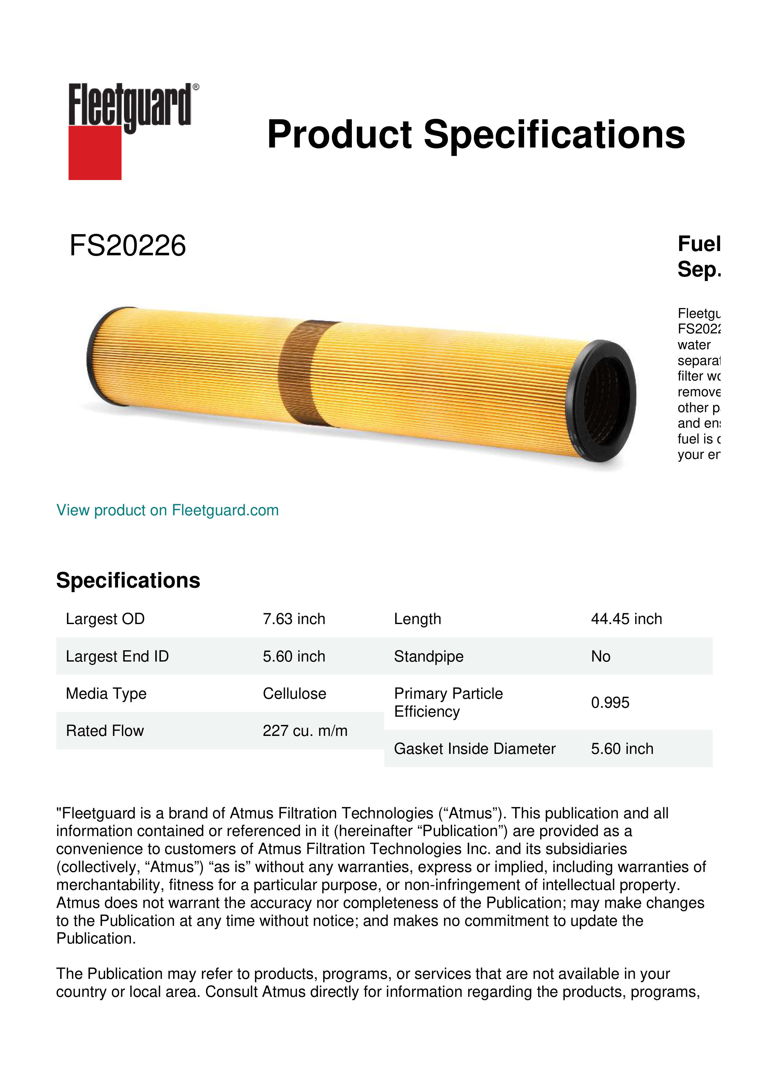 Fleetguard® FS20226 fuel water separator cartridge filter works to remove water and other particulates and ensures clean fuel is delivered to your engine.Specification