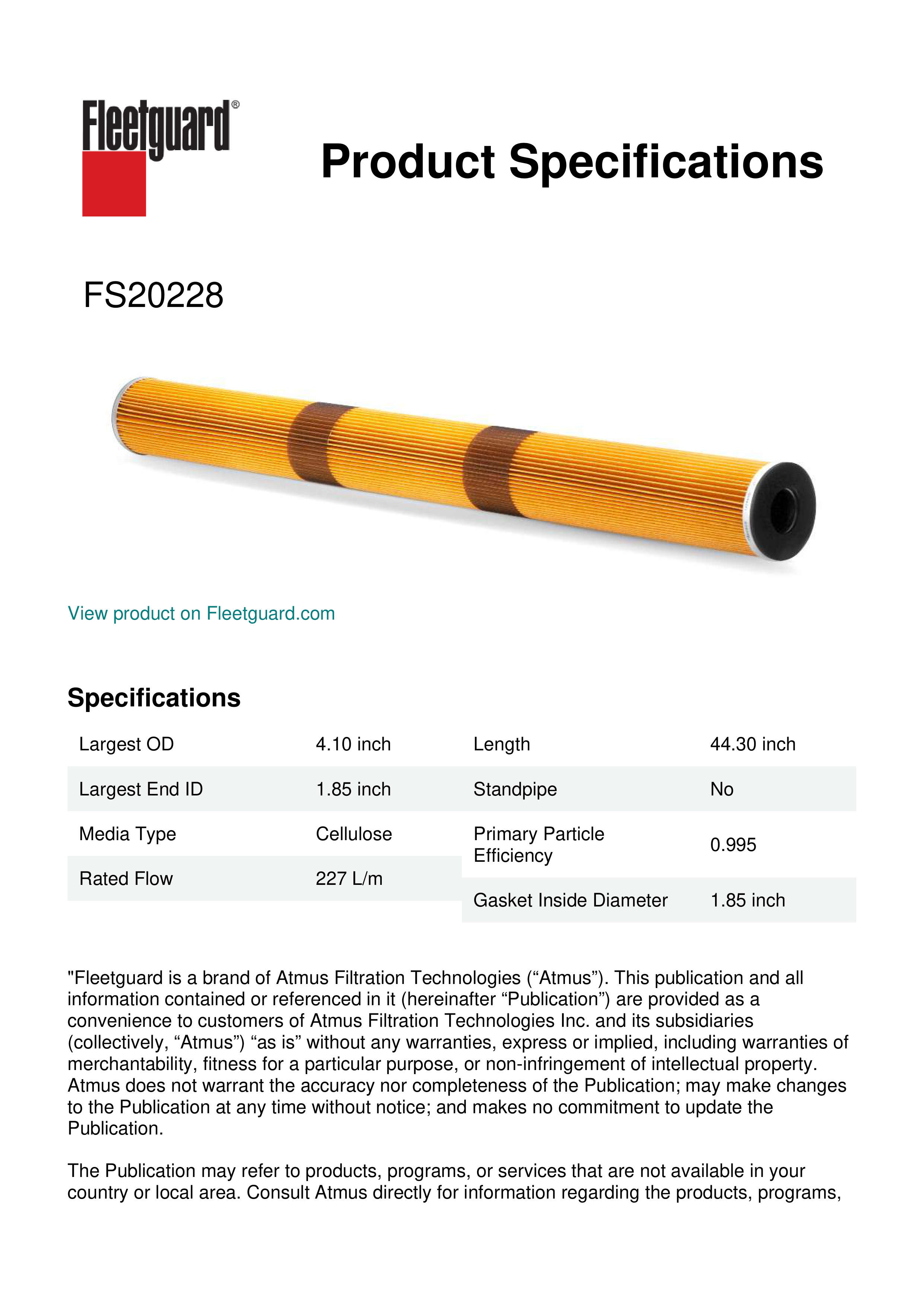 Fleetguard® FS20228 fuel water separator cartridge filter works to remove water and other particulates and ensures clean fuel is delivered to your engine.Specification