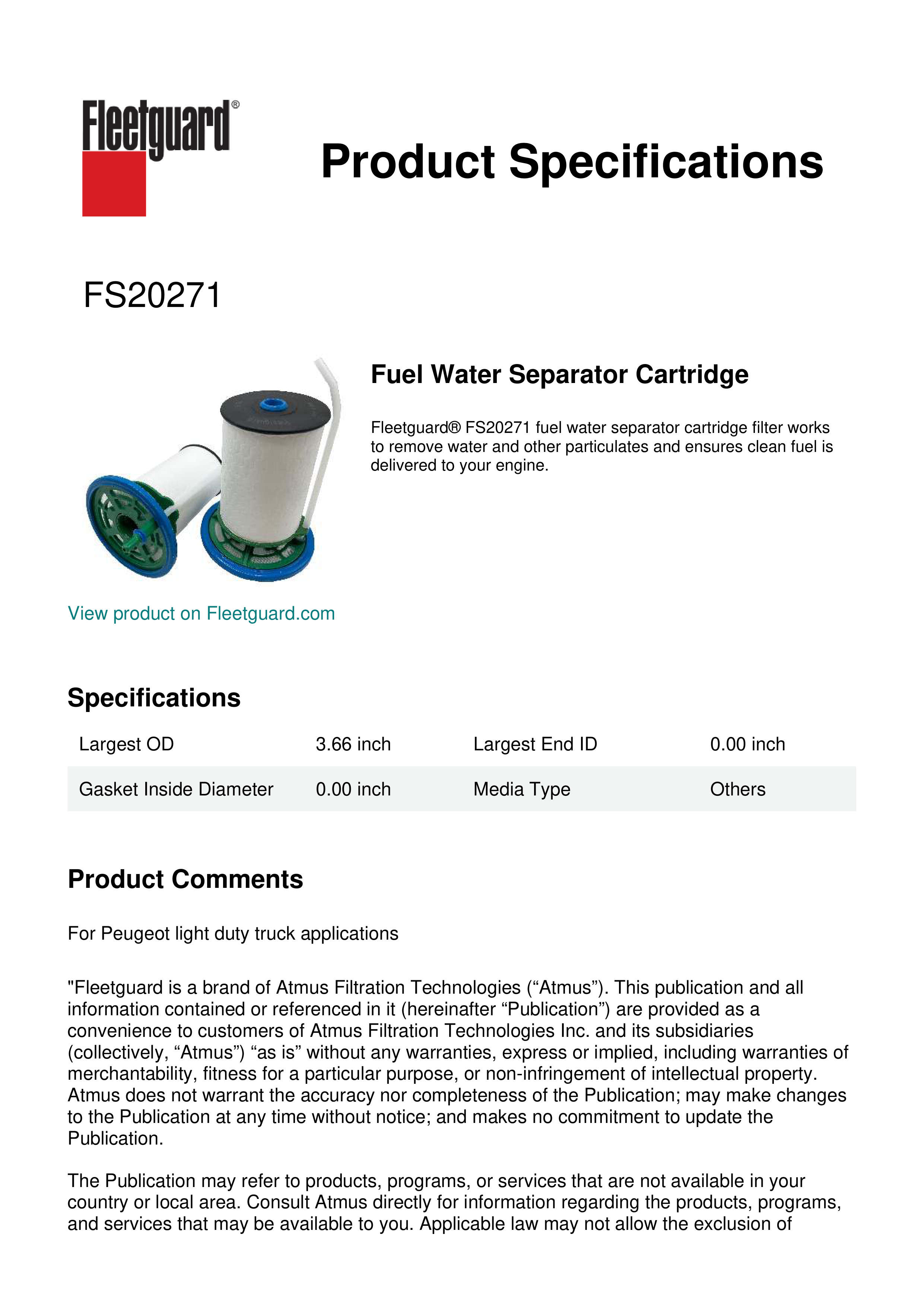Fleetguard® FS20271 fuel water separator cartridge filter works to remove water and other particulates and ensures clean fuel is delivered to your engine.Specification