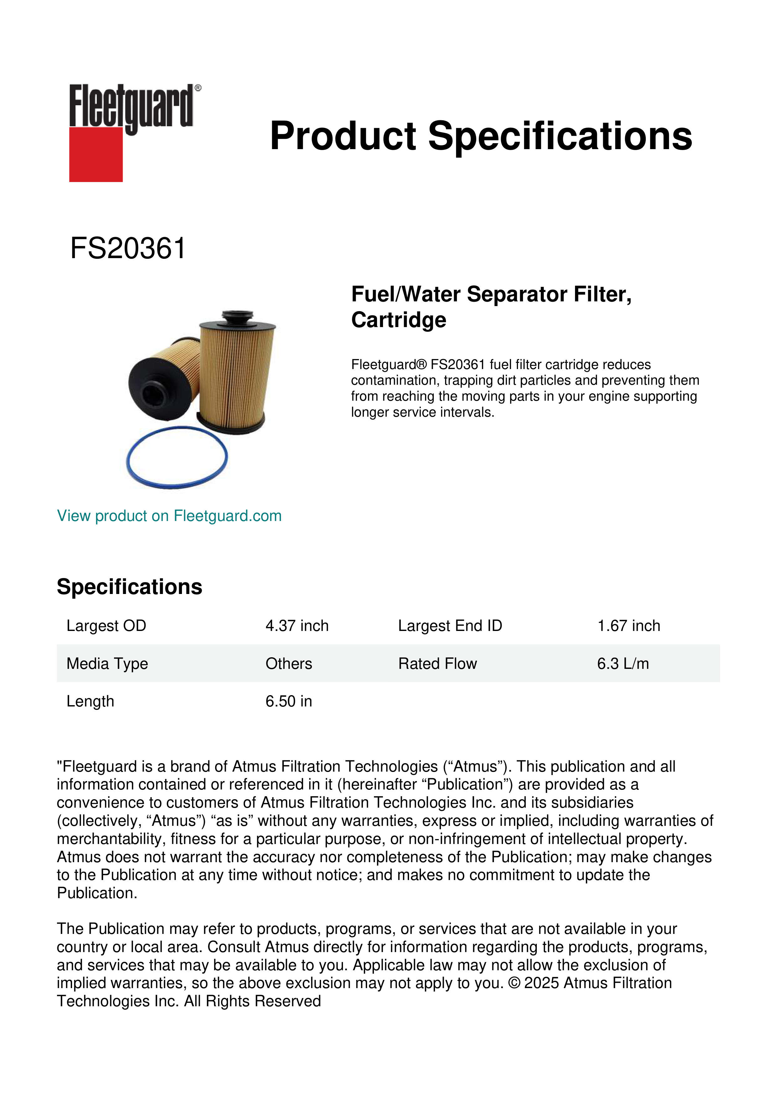 Fleetguard® FS20361 fuel filter cartridge reduces contamination, trapping dirt particles and preventing them from reaching the moving parts in your engine supporting longer service intervals.Specification