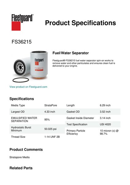 Fleetguard® FS36215 fuel water separator spin-on works to remove water and other particulates and ensures clean fuel is delivered to your engine.Specification