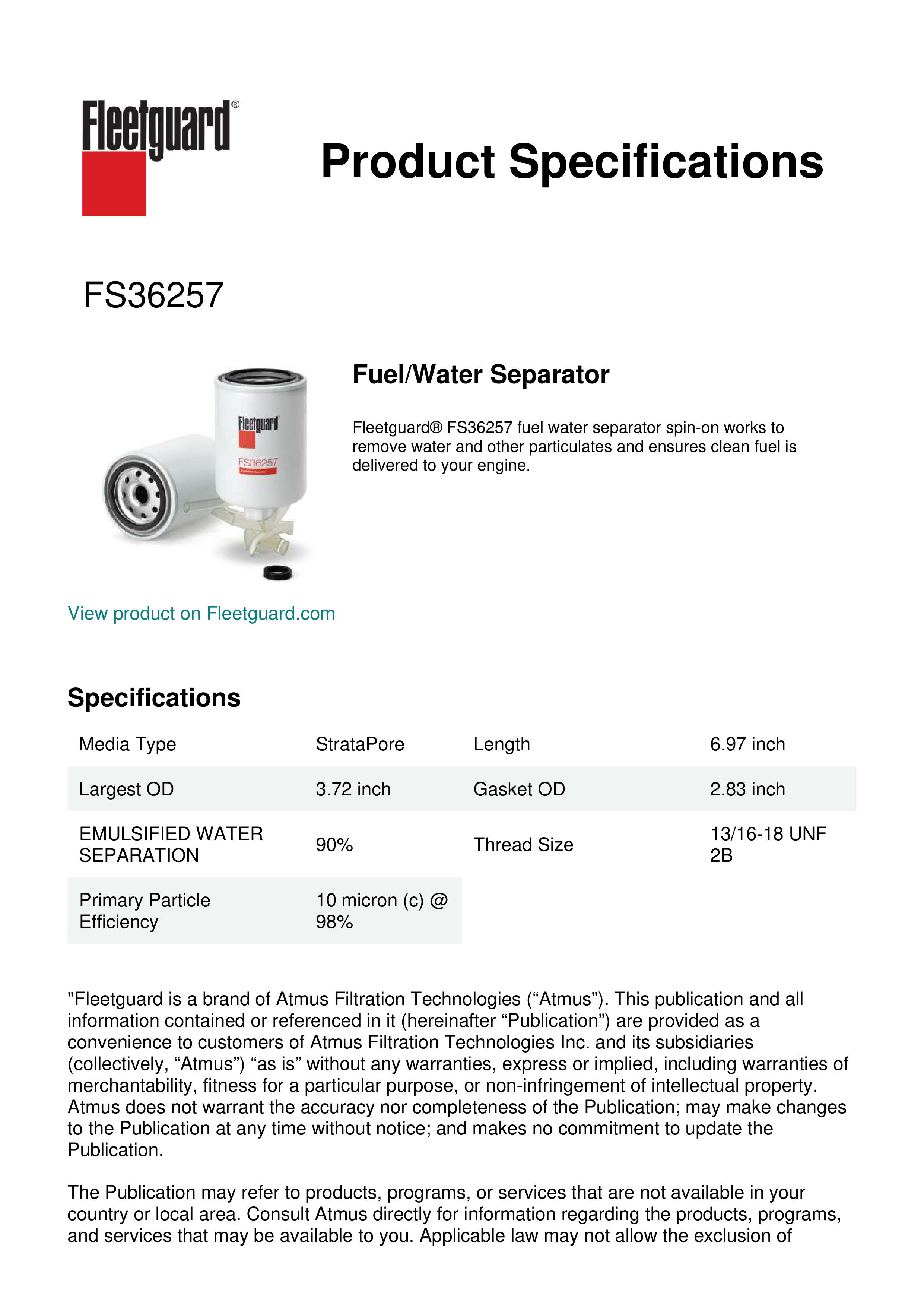 Fleetguard® FS36257 fuel water separator spin-on works to remove water and other particulates and ensures clean fuel is delivered to your engine.Specification