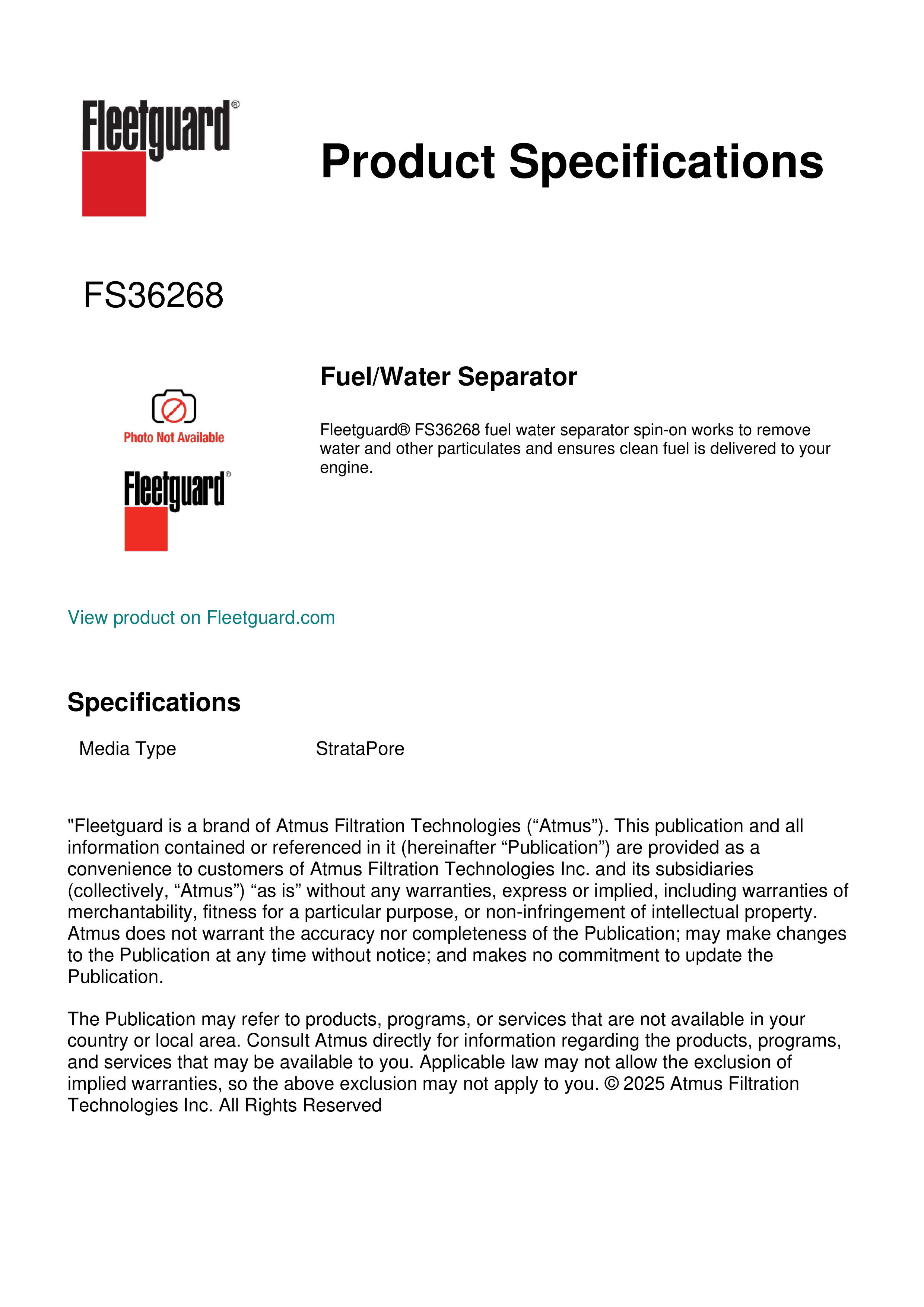 Fleetguard® FS36268 fuel water separator spin-on works to remove water and other particulates and ensures clean fuel is delivered to your engine.Specification